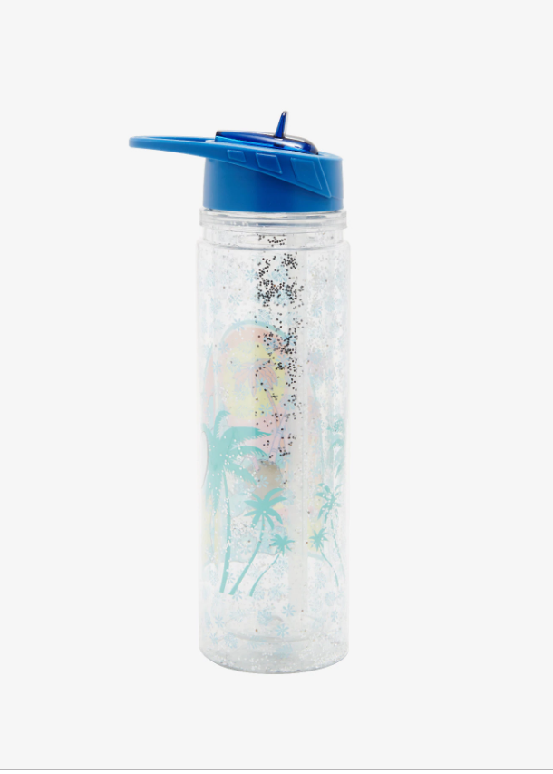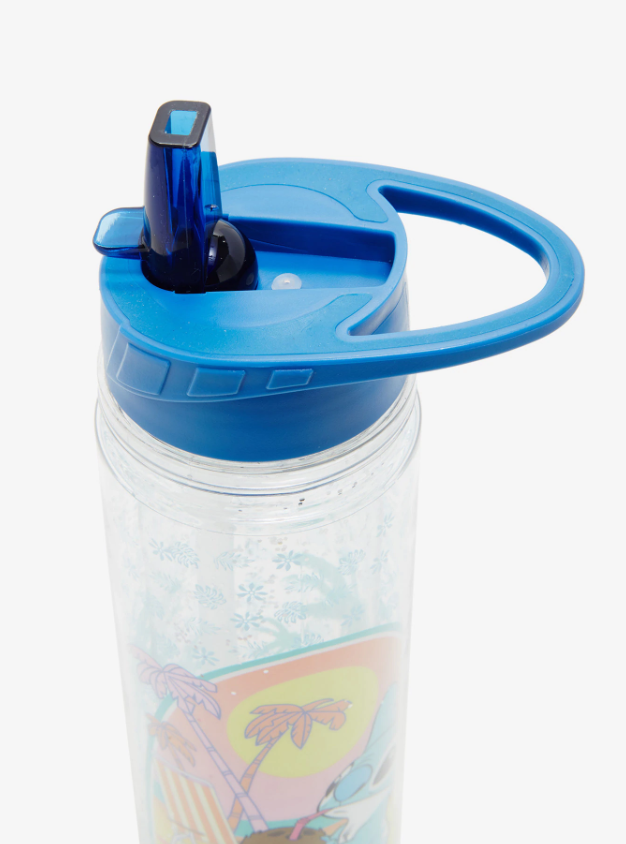 Si Stitch se queda sin cocos para beber, ¡puede tener esta botella de agua con tapa abatible Lilo & Stitch! ¡El gráfico en la playa junto al pastel se muestra con el brillo azul alrededor de la botella!