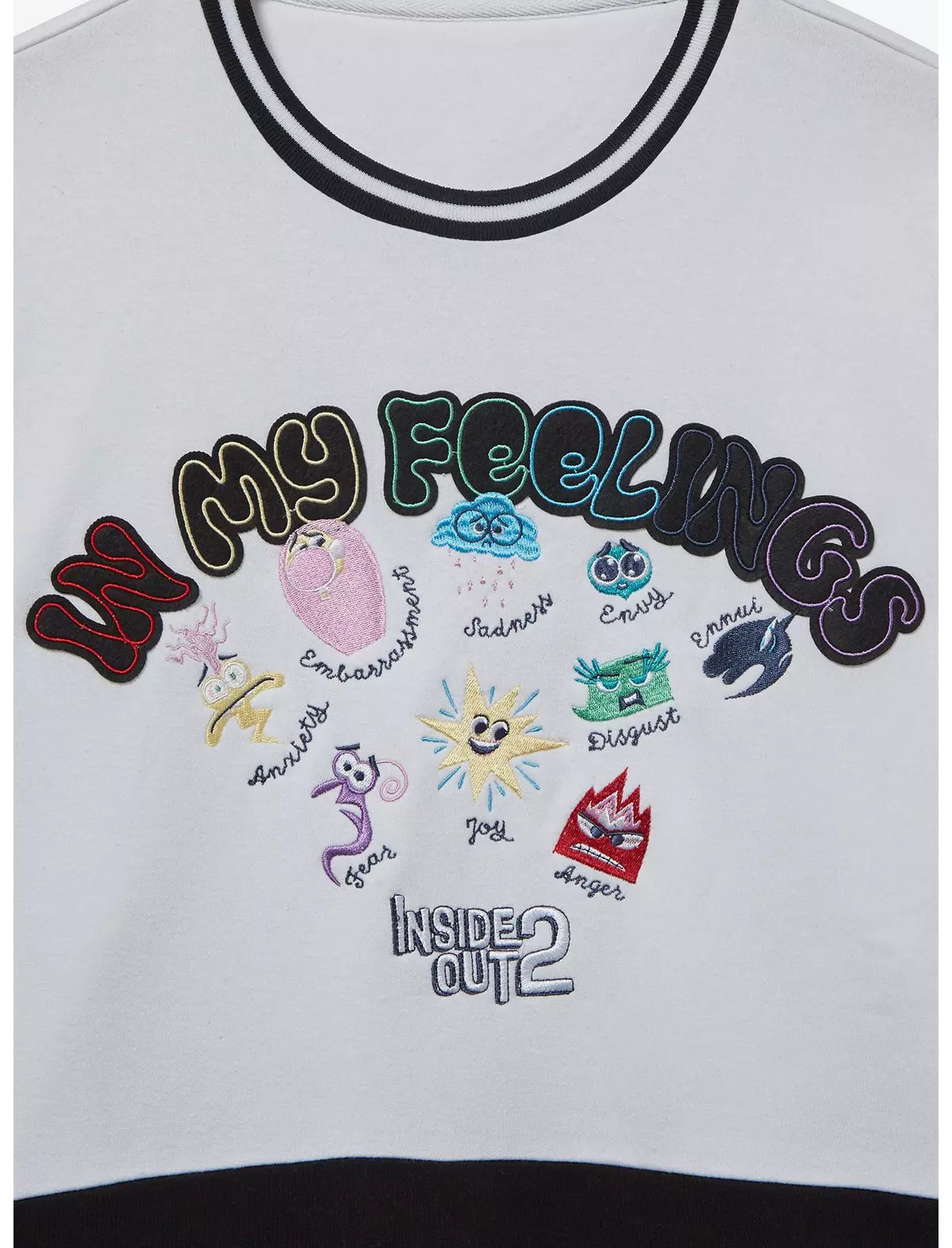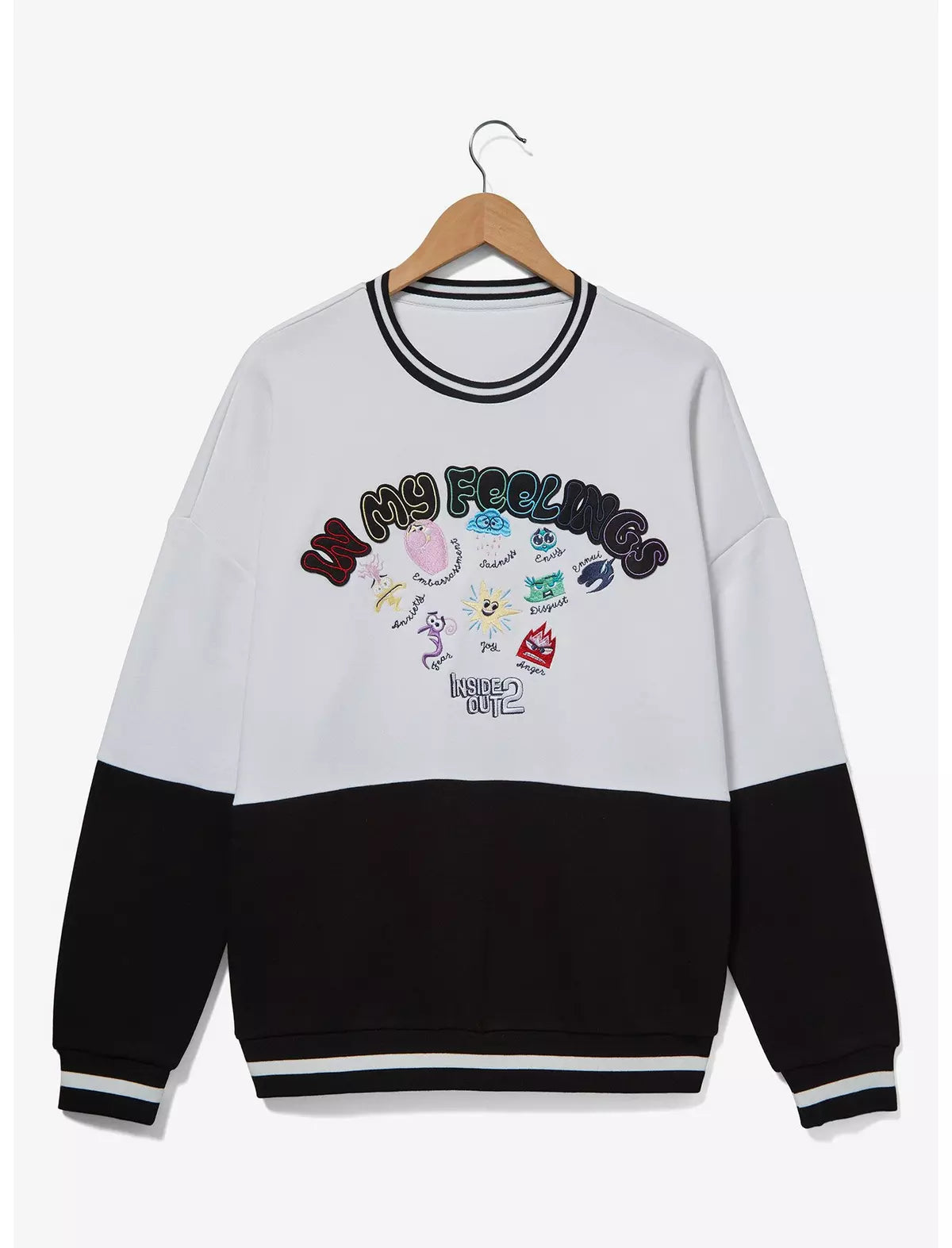 ¡Muestra tus emociones con estilo con este cuello redondo inspirado en Inside Out 2! Con diseños bordados de las diferentes emociones junto a sus nombres, el frente de esta sudadera incluye letras aplicadas "In My Feelings". Con un diseño de bloques de color y dobladillos acanalados, este suéter es perfecto para tu próxima noche de cine.