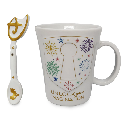 Mickey y Disney juntos "Desbloquearán su imaginación" con este juego de tazas y llaves. Un lado de la taza de cerámica tiene un ojo de cerradura, mientras que la cuchara de cerámica a juego se basa en las llaves de la ceremonia de apertura de nuestra tienda Disney.