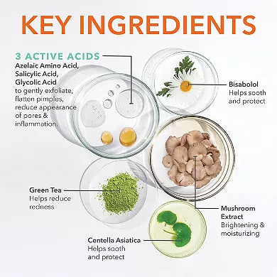 Ácido Salicílico 2%, Ácidos Glicólico y Azelaico, Té verde, Bisabolol, Extracto de Hongo, Centella, Agua, Alcohol desnaturalizado, Agua de Hamamelis, Polímeros, Butilenglicol, Dimetil Isosorbida, Glicerina, Hidróxido de Potasio, Polisorbato 20, Carnitina HCl, Gluconolactona, Ácido Fítico, Extracto de Cardo Mariano, Vitex Agnus-Castus, Tetrahydrocurcumina, Glutatión, Azeloglicinato de potasio, Aloe, Fosfolípidos, Ácido Hialurónico, Isoflavonas de soya, Extracto de manzanilla, Zinc PCA, Alantoína, Niacinamida, Péptidos, Extractos vegetales, y más.