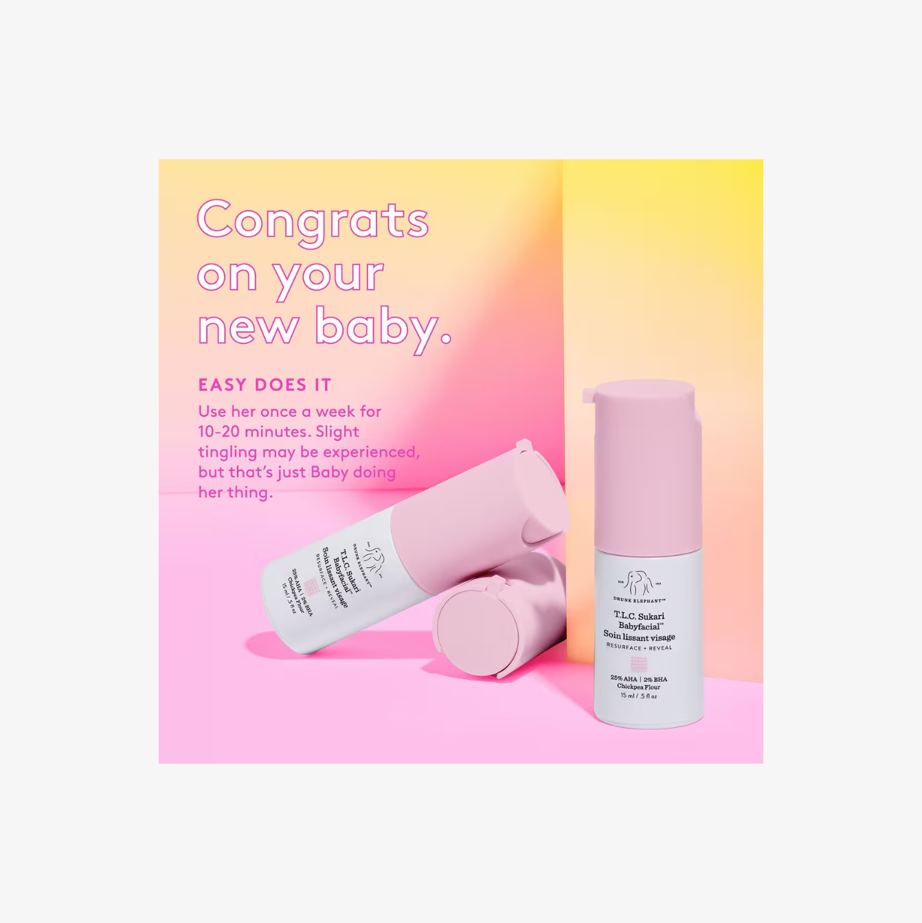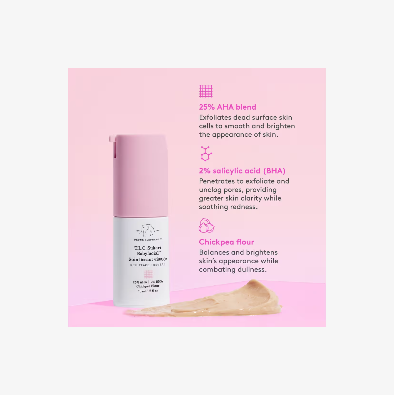El Mini T.L.C. Sukari Babyfacial de Drunk Elephant es un tratamiento facial profesional que combina 25% AHA y 2% BHA para exfoliar, mejorar la textura, unificar el tono y revelar un cutis más radiante y juvenil.