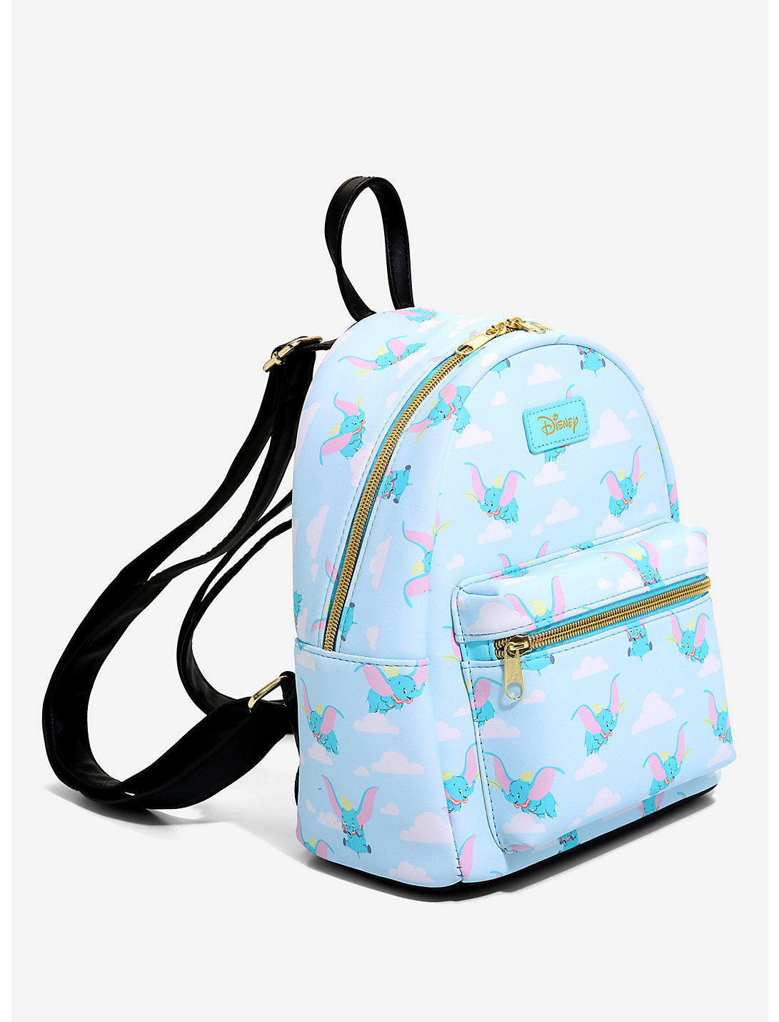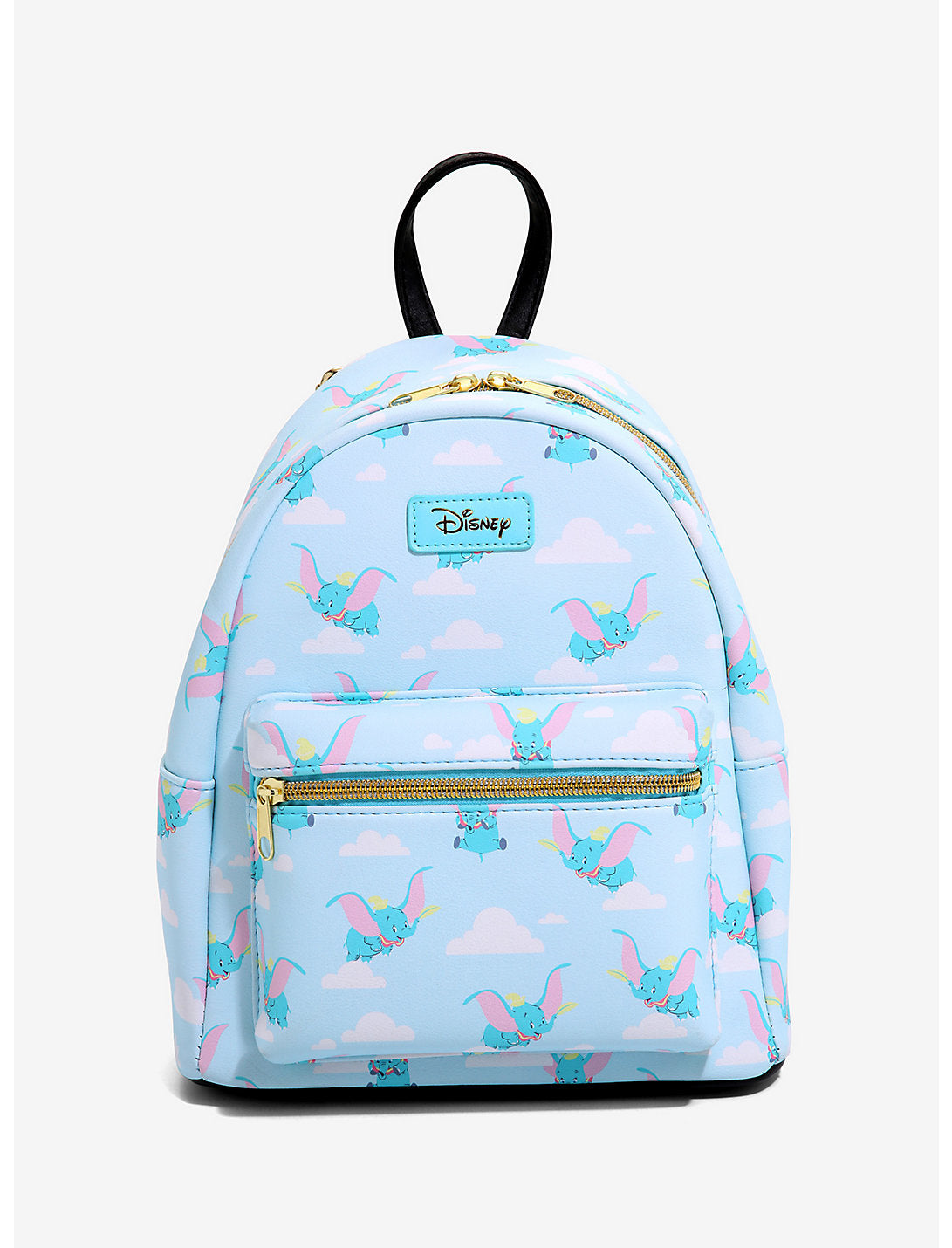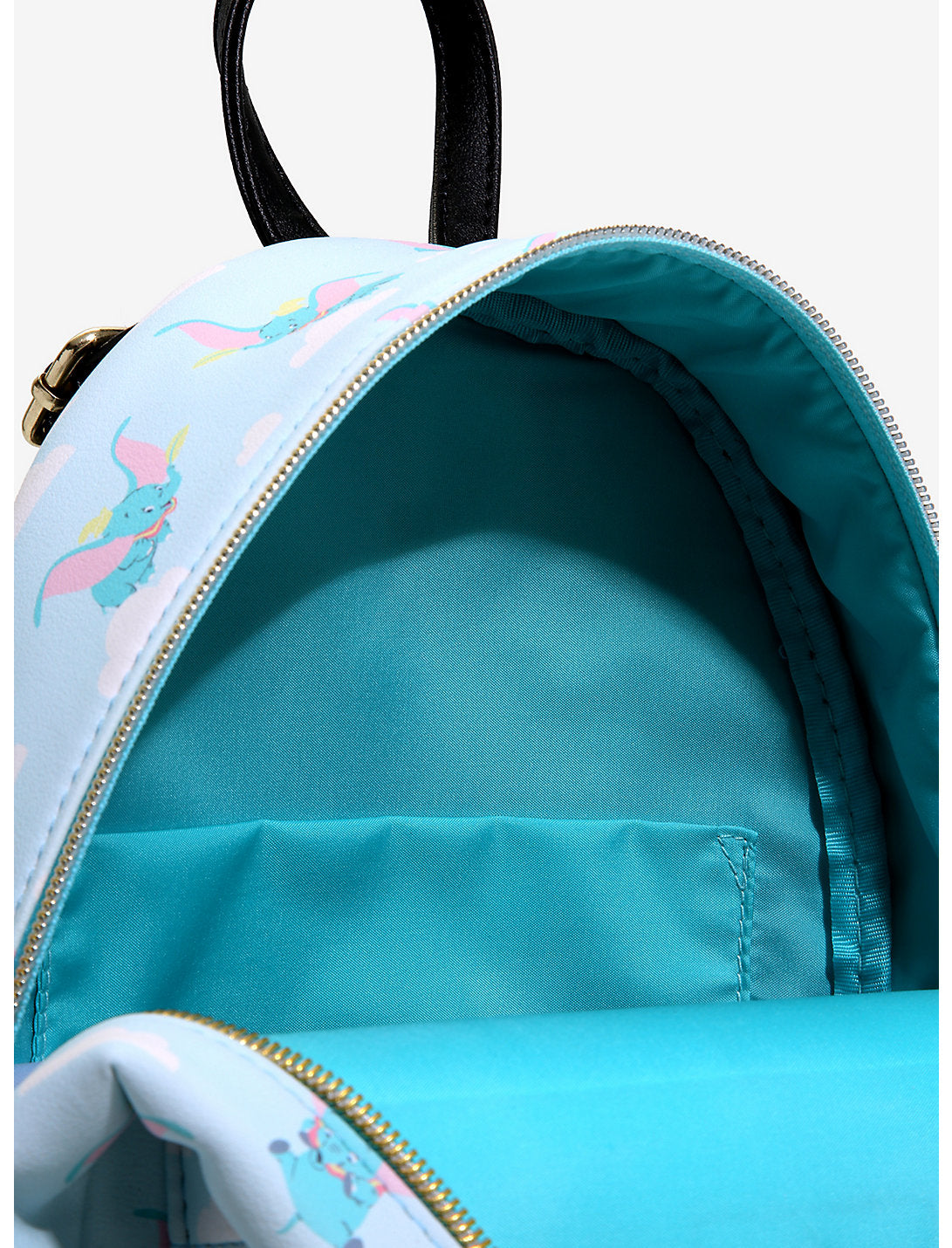 Deja volar tus cosas con esta mini mochila azul claro de Disney con un estampado de Dumbo volando en las nubes. El interior tiene forro azul y un bolsillo abatible.