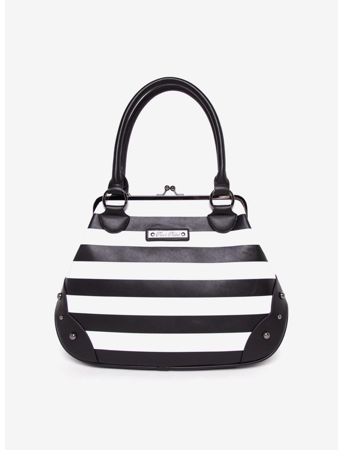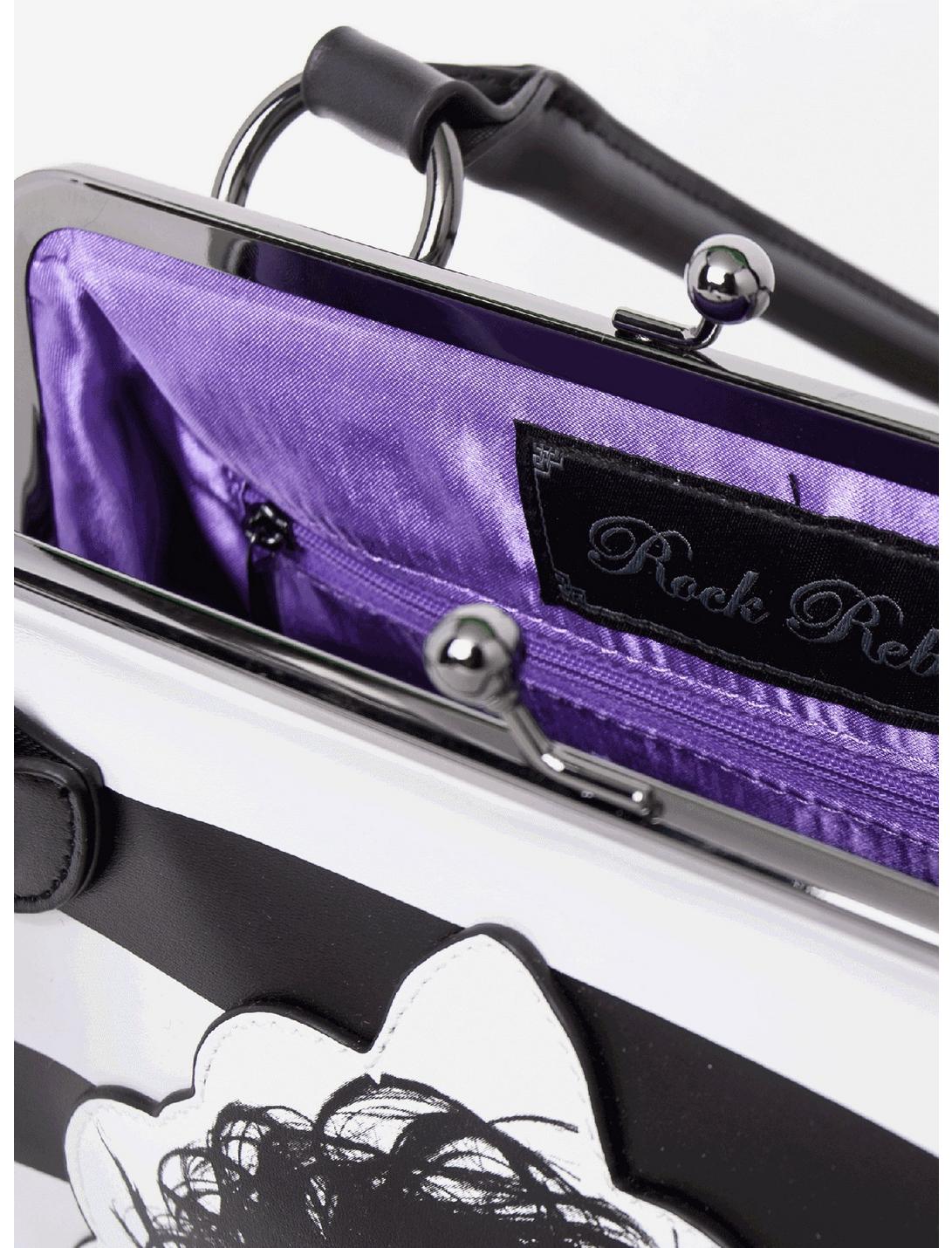 Celebre la película clásica Eduardo Manostijeras con este super lindo bolso con cierre tipo beso de Rock Rebel. Tiene un retrato de Edward en un lado y rayas en el otro. Hay tachuelas que decoran las esquinas, un bolsillo interior con cremallera y asas de transporte superiores.
