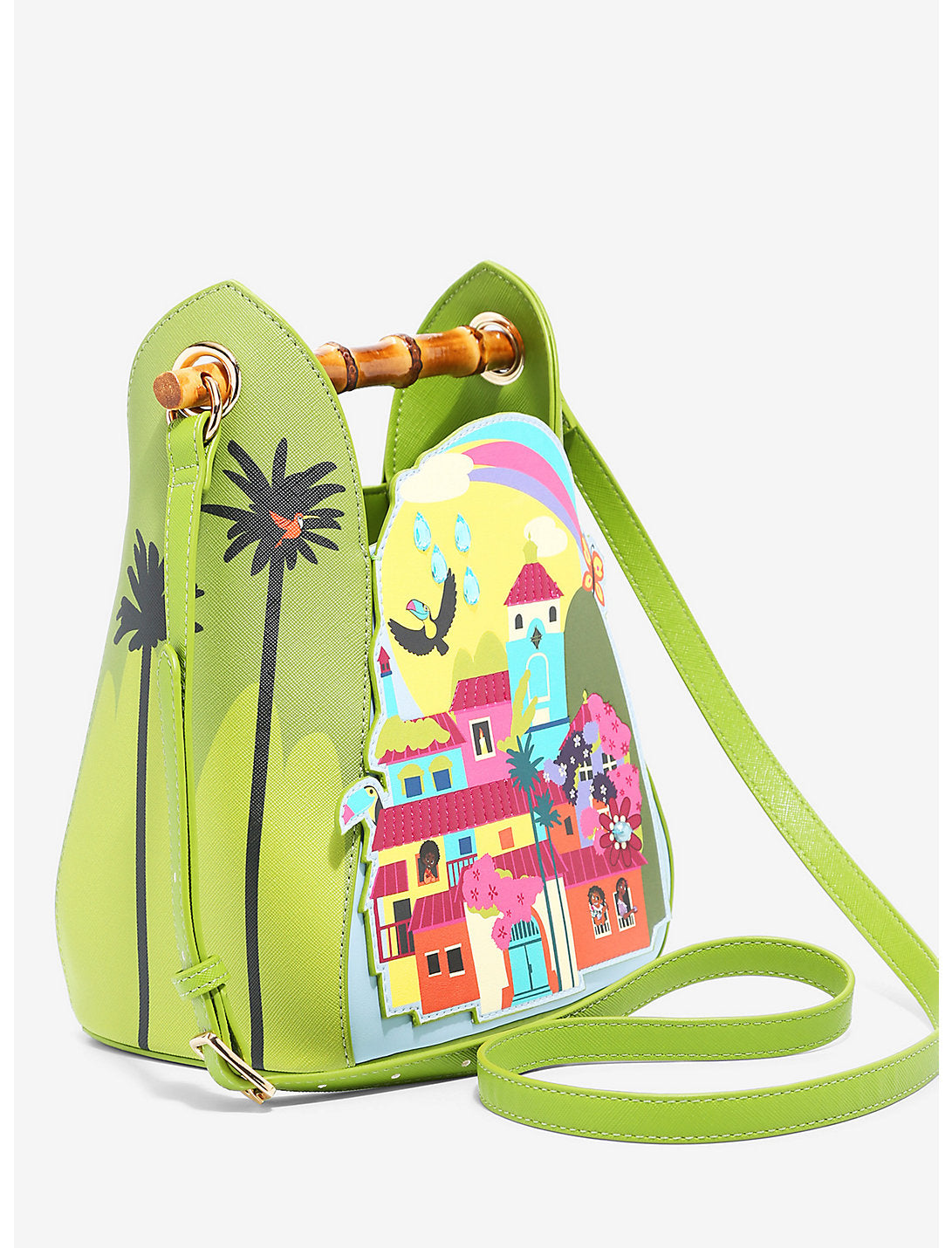 ¡Trae una pieza del Encanto de Disney a tu guardarropa con este estilo verdaderamente encantador! Con un diseño de figura troquelada de la casa de la familia Madrigal, aplicaciones de joyas y otros detalles escénicos de la hermosa ciudad montañosa colombiana de la película, Mirabel y su familia mágica te acompañarán en todas tus aventuras siempre que te pongas este bolso bandolera de Danielle Nicole. . También cuenta con una correa para el hombro ajustable, un logotipo de la marca en relieve en la parte posterior, una insignia de la marca troquelada y un asa de imitación de bambú para combinar con el tema tropical del bolso.