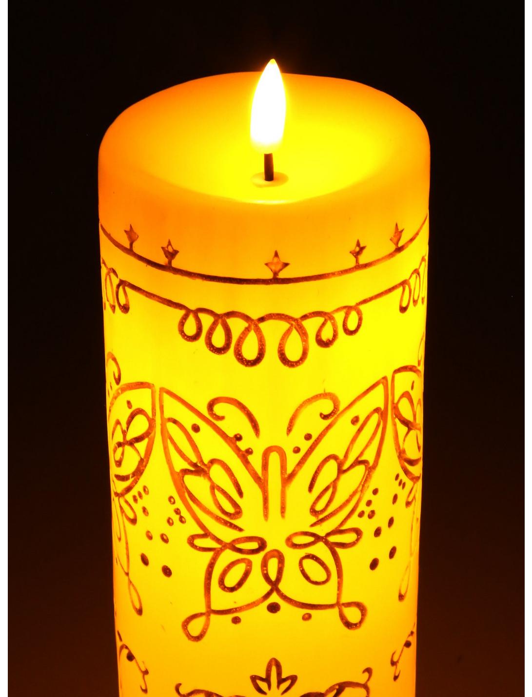 El recipiente siempre encendido del milagro de la familia Madrigal es una hermosa adición a la decoración de cualquier persona, ¡incluida la tuya! Agregue la vela milagrosa a su hogar con esta réplica de la vela de Alma con luces LED. Con un exterior ceroso con diseños grabados para imitar la apariencia de una vela real, esta luz es la manera perfecta de llevar una pieza de Disney's Encanto directamente a tu hogar. También cuenta con un apagado automático de 30 minutos.