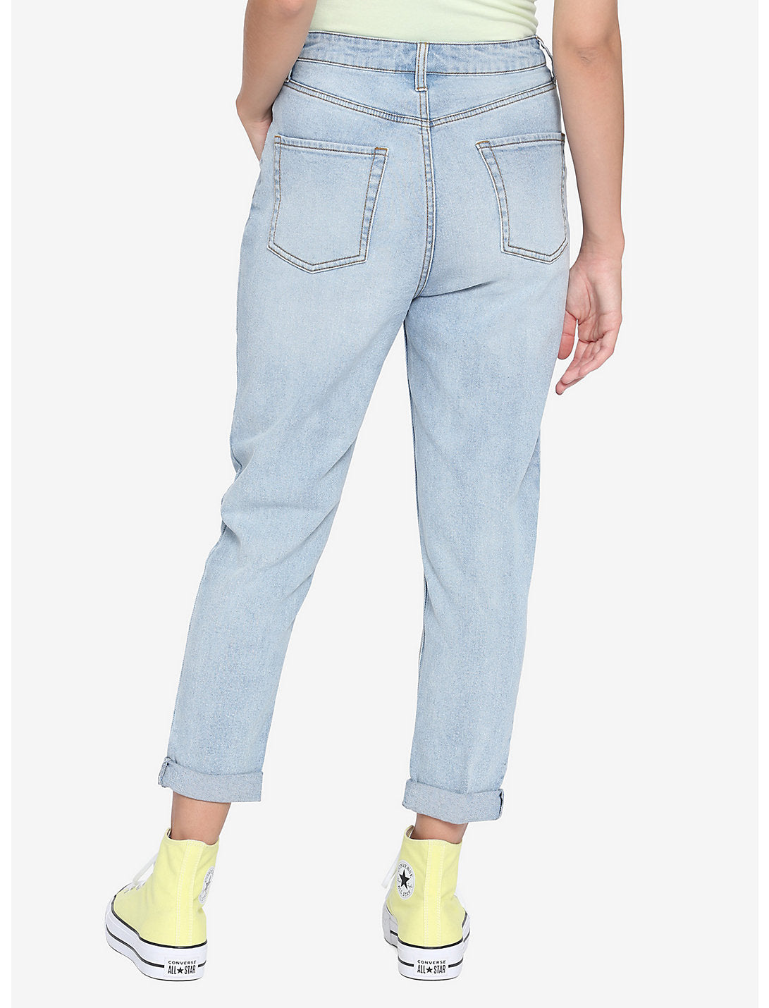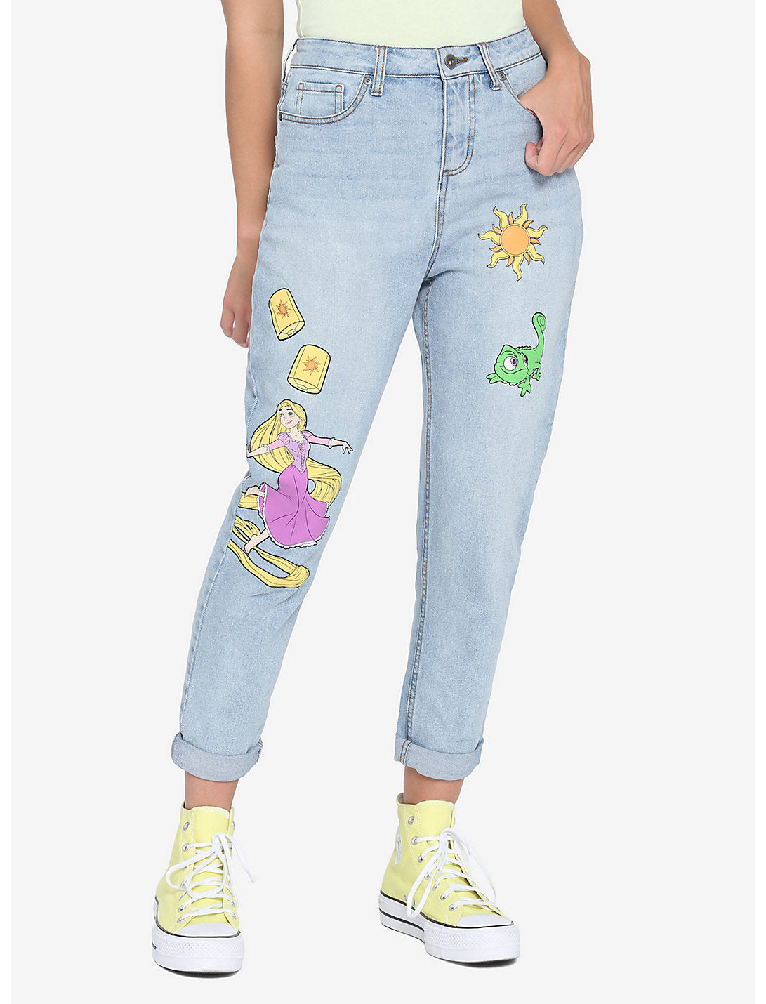 ¿Planeando un día fuera de la torre? ¡Tenemos los jeans para ti! De Tangled, estos jeans mom de lavado claro se ajustan a tu gusto y tienen parches de Rapunzel, las linternas, pascal y el logotipo del sol del Reino en la parte delantera.