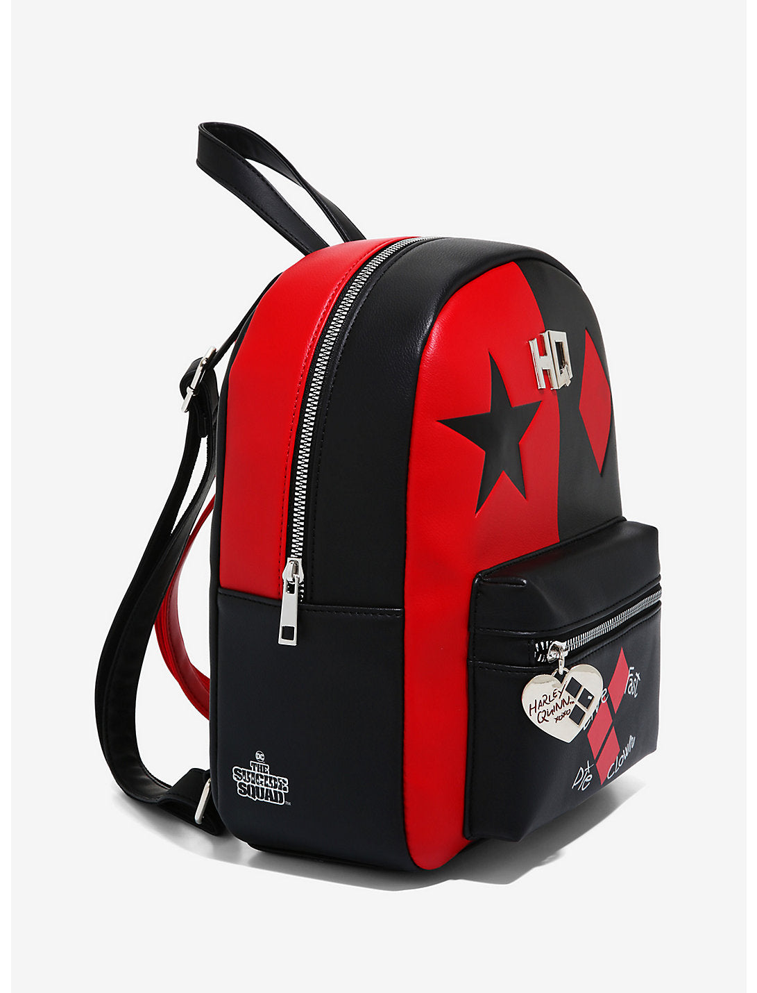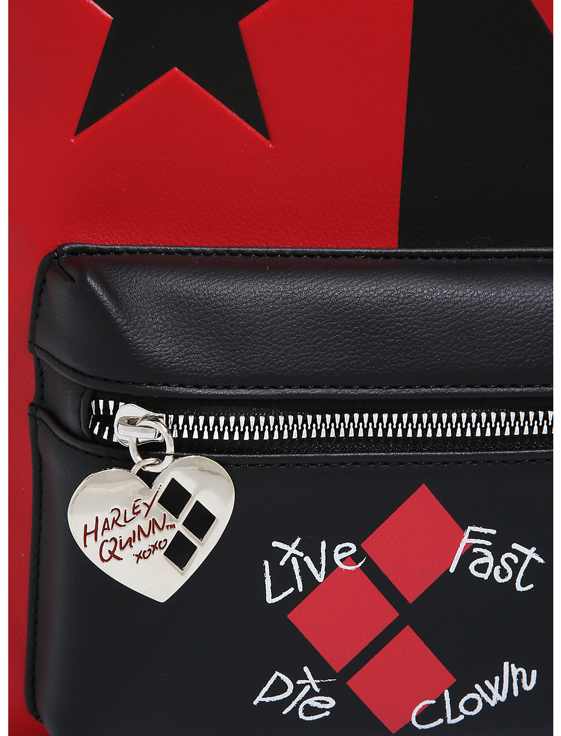La personalidad caótica de Harley Quinn está por todas partes en esta mini mochila, que presenta un emblema de metal con sus iniciales, una estrella y un diamante en relieve, la frase "Live fast die clown" y un dije de cremallera de metal plateado. Correas ajustables.