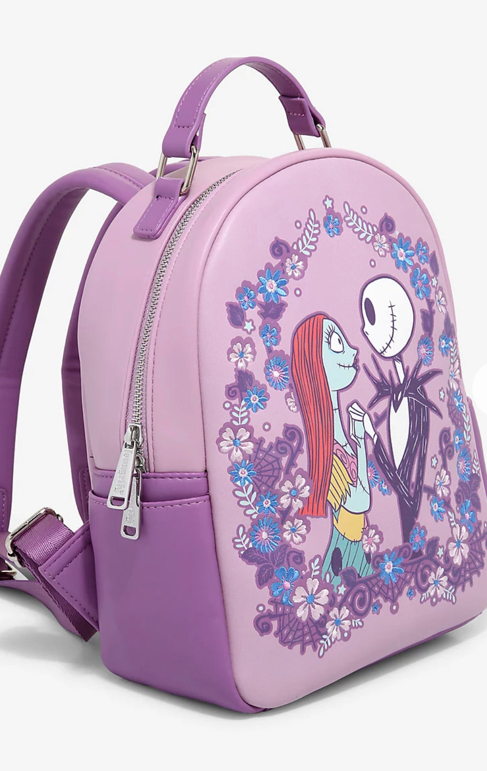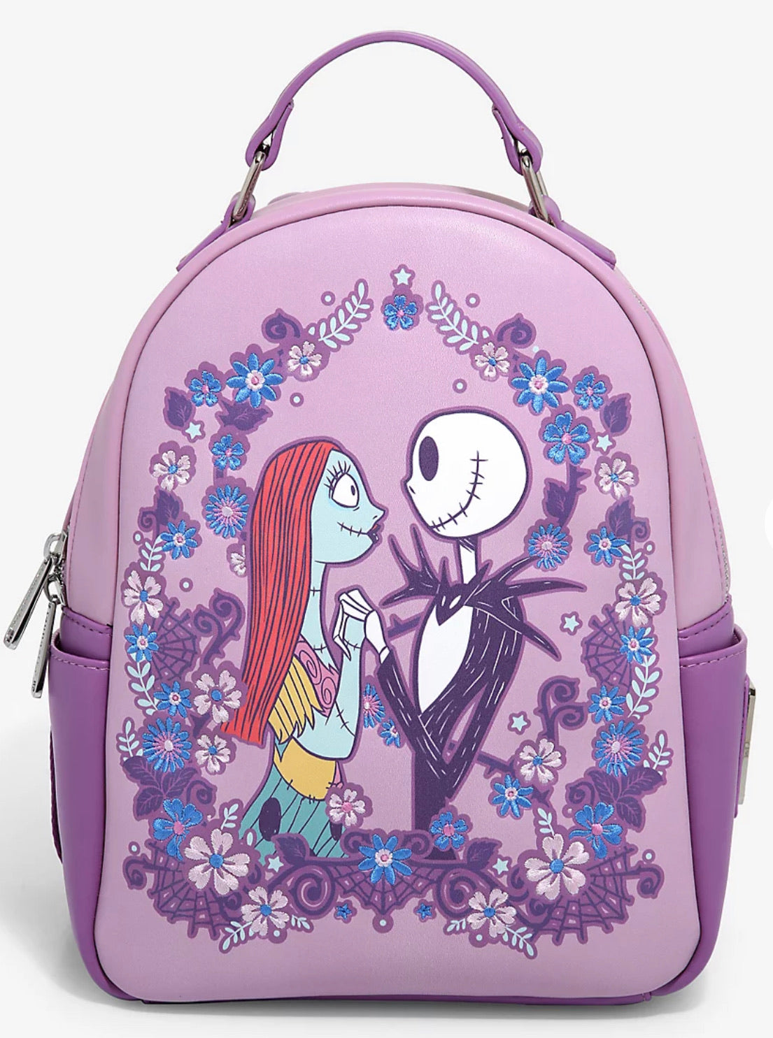 ¡El amor de Jack y Sally está en plena floración! Rodeado de bordados de flores y gráficos, el Rey Calabaza y la muñeca de trapo se abrazan en la parte delantera de esta mini mochila morada de piel sintética de Loungefly. Parte de nuestra colección The Nightmare Before Christmas con un toque primaveral, este accesorio de Disney es moderno y funcional con un bolsillo interior con cremallera y bolsillos laterales, correas ajustables, una insignia de la marca esmaltada y un forro interior con un patrón floral de murciélago a juego.