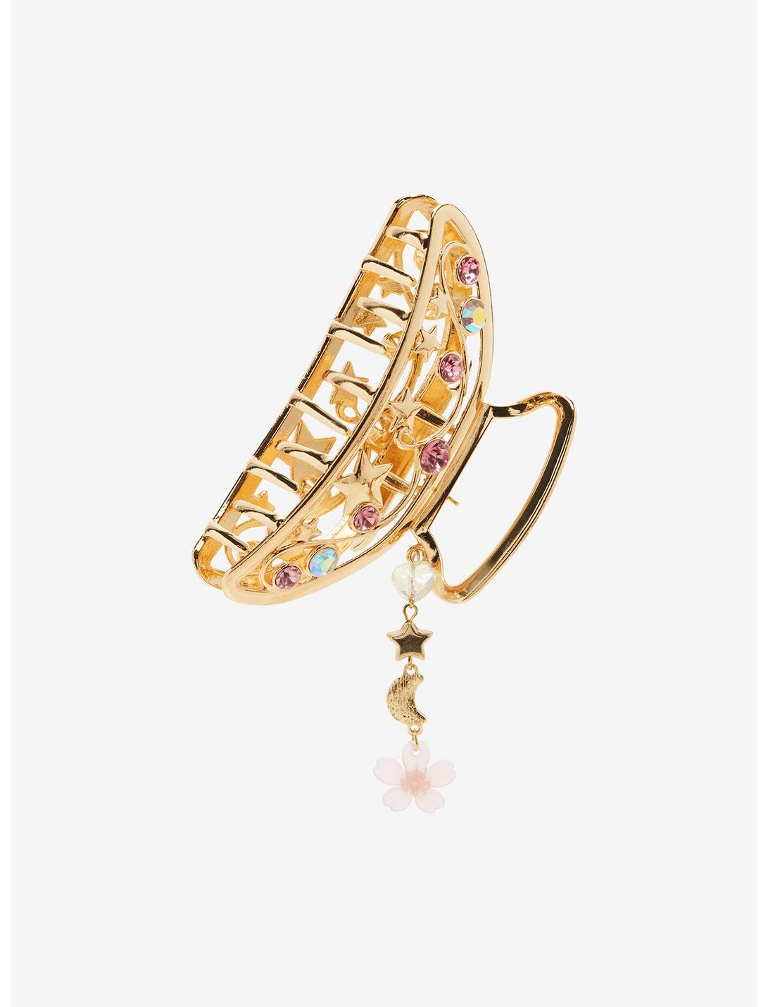 ¡Lleva tu peinado a las estrellas y más allá con esta pinza para el cabello con forma de garra dorada! Con estrellas y gemas multicolores incrustadas por todas partes, y se completa con un dije colgante con delicados dijes celestiales, de corazón y de flores.