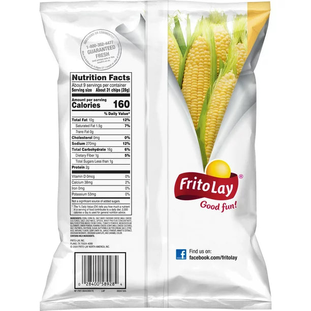 Fritos® Chili Cheese Chips de Maíz 9.25 oz. Bolsa: 9.25 oz. bolsa de chips de maíz con sabor a queso con chile FRITOS Más sabor a sus chips de maíz con la delicia del queso con chile Comparta una bolsa con amigos, familiares y compañeros de trabajo