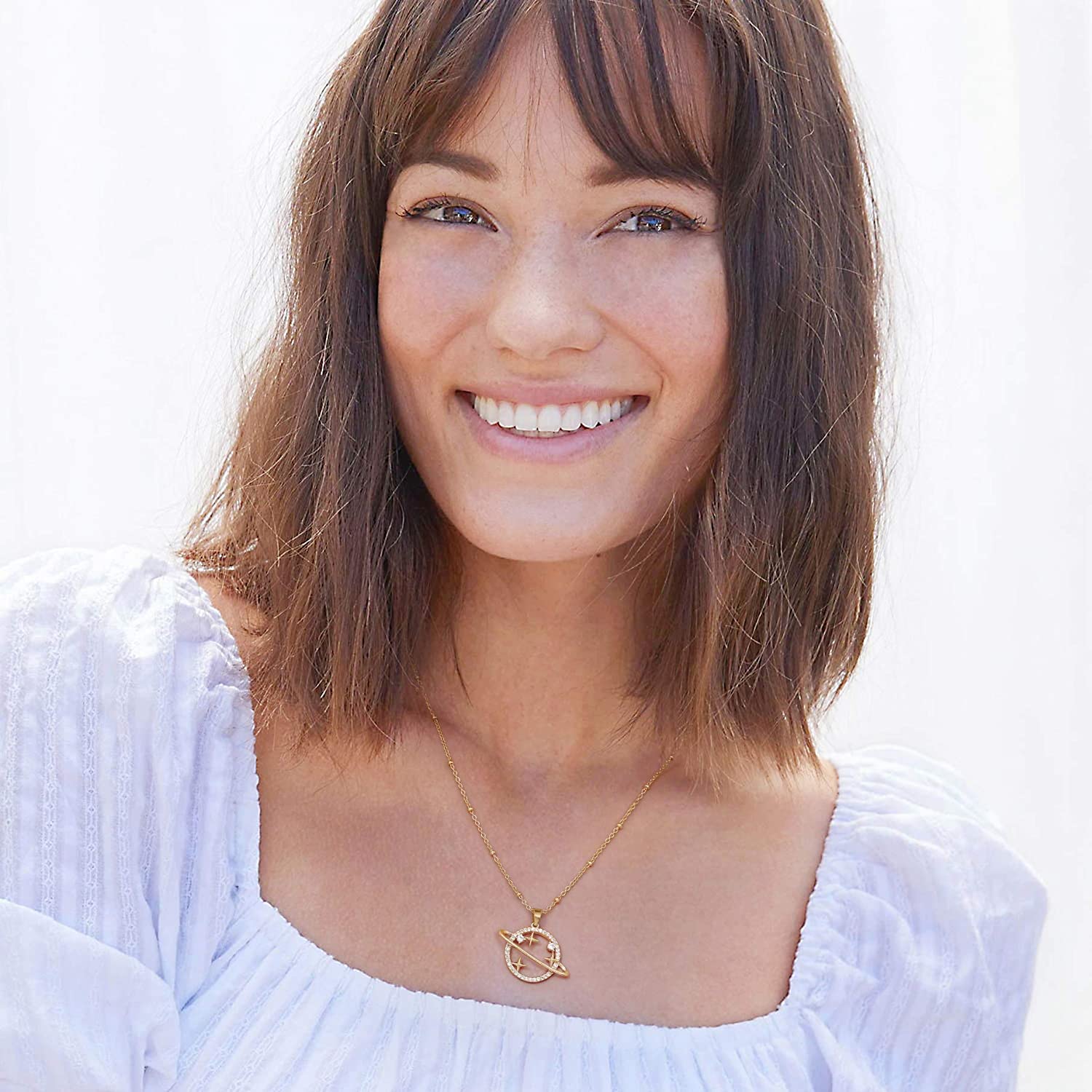 El collar de oro de 18k se puede ajustar de 20” a 22”, sin preocupaciones de tamaño. La delicada cadena satélite permite que el collar de cadena sea duradero y delicado. Con microincrustaciones de halo de circonita cúbica transparente en el colgante de 23 mm de ancho x 16 mm de alto, el elegante collar con colgante de Saturno es brillante y hermoso.