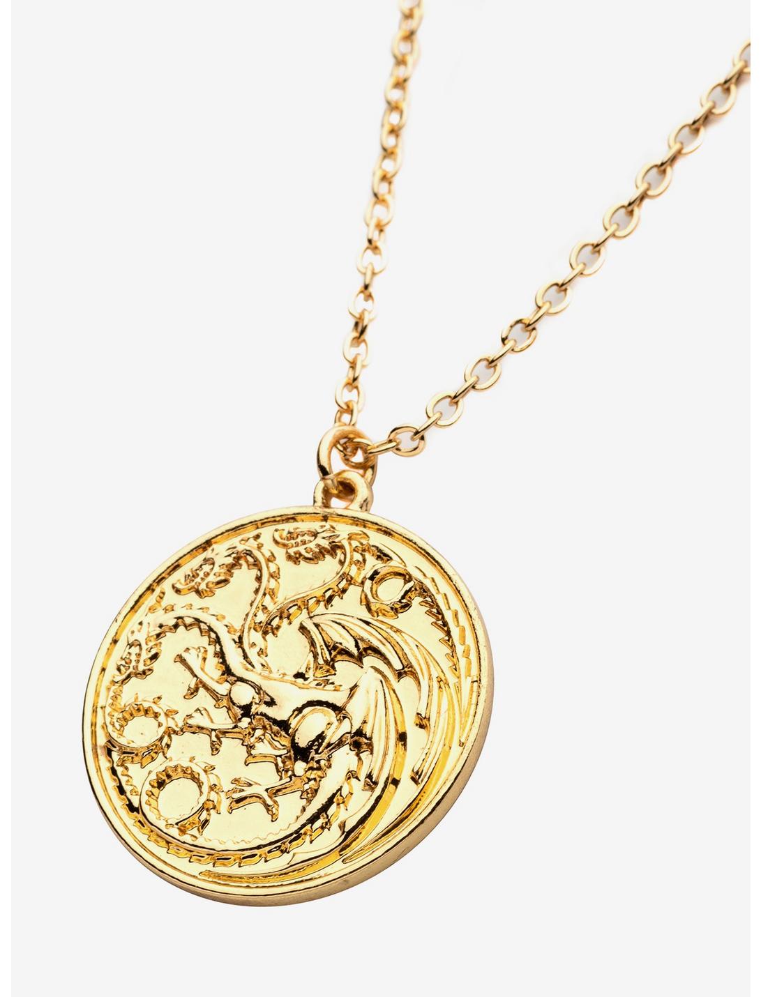 Representa tu lealtad a la Casa Targaryen con este collar de House of the Dragon. Esta pieza dorada presenta un colgante circular del sigilo Targaryen.
