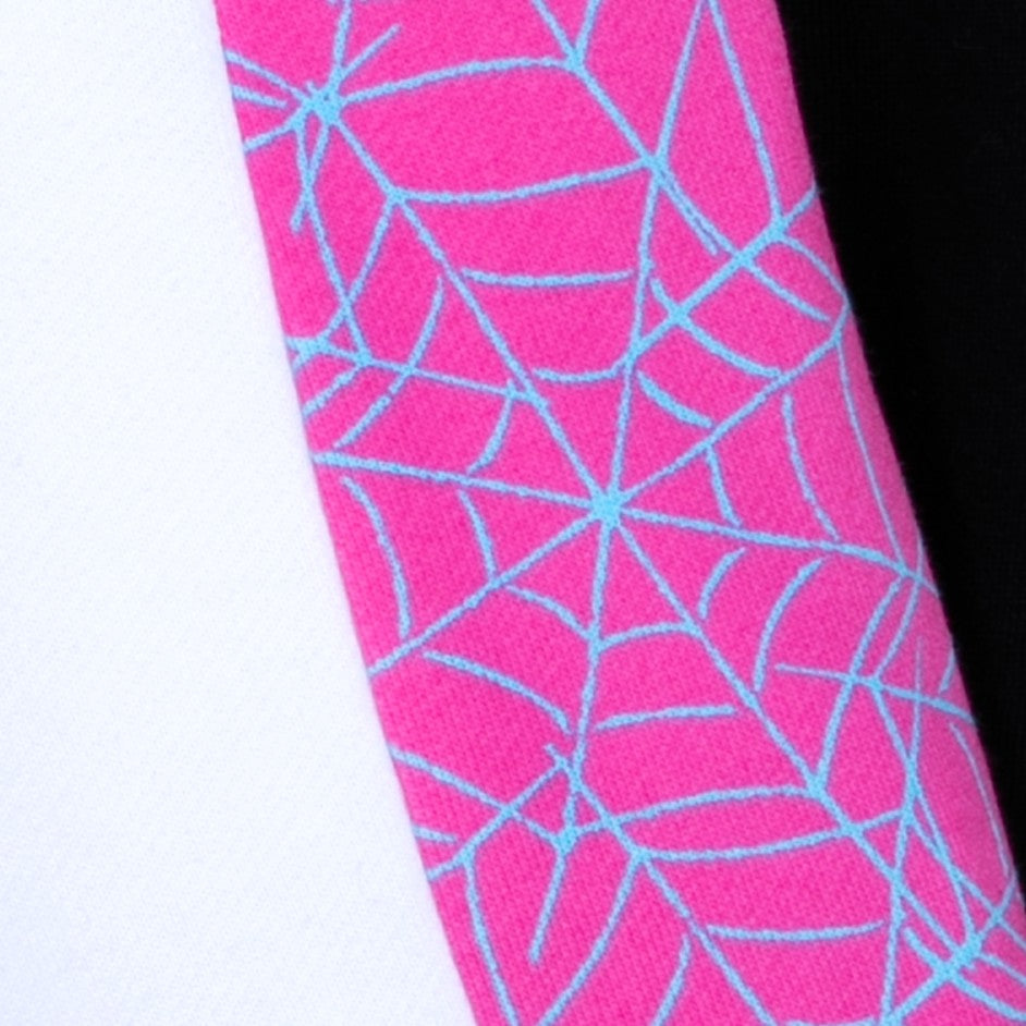 Patrón de telaraña rosa y azul en la mitad inferior de las mangas