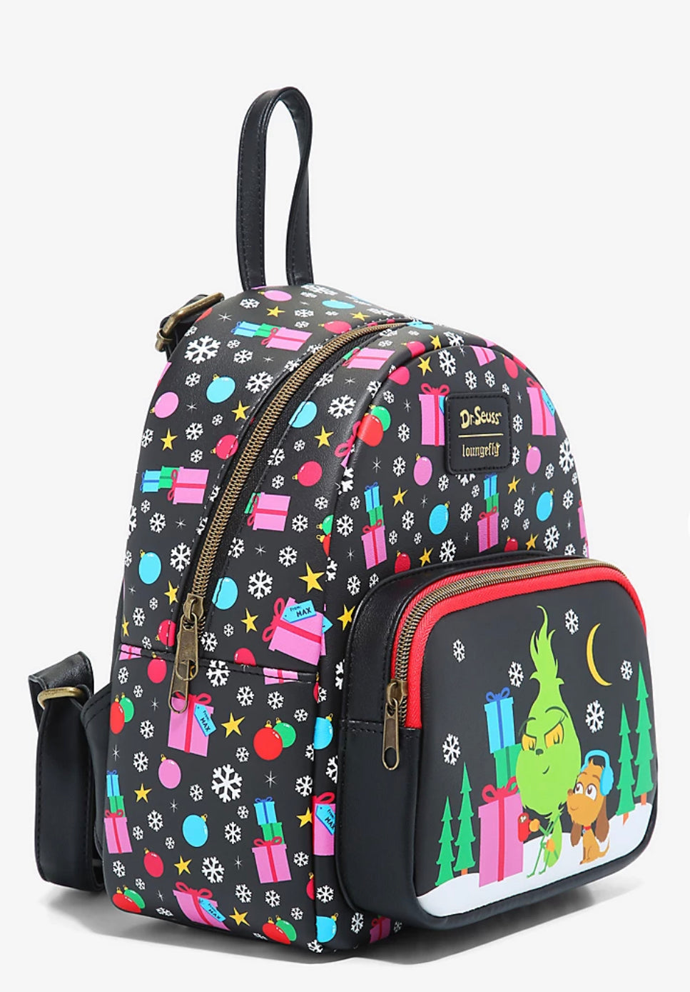 ¡Parece que el corazón del Grinch ya ha crecido tres tamaños más! ¡Así es como el Grinch se robó la Navidad! La mini mochila presenta a un Grinch sonriente bebiendo chocolate y listo para darle a Max algunos regalos. El resto de la mochila tiene un estampado de los mejores regalos y adornos de Whoville.