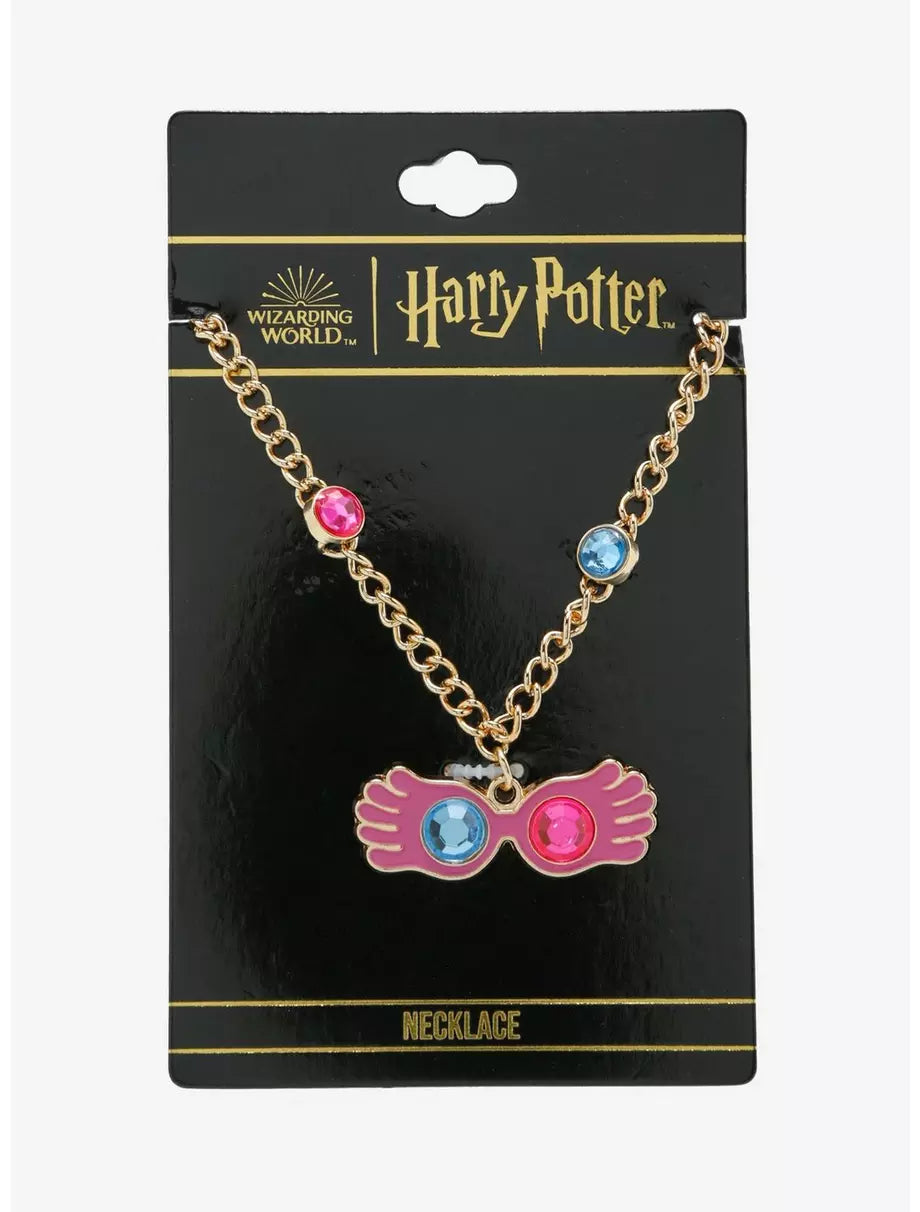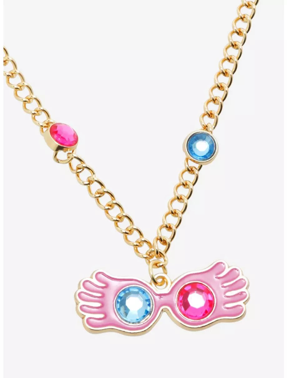 ¡Sé cualquier cosa menos excepcionalmente común y corriente con este collar de Harry Potter! ¡Con un colgante de espectrospecs de Luna Lovegood y detalles de gemas rosas y azules! Extensor de 18'' + 3'' Colgante de 1 1/2'' Aleación sin níquel