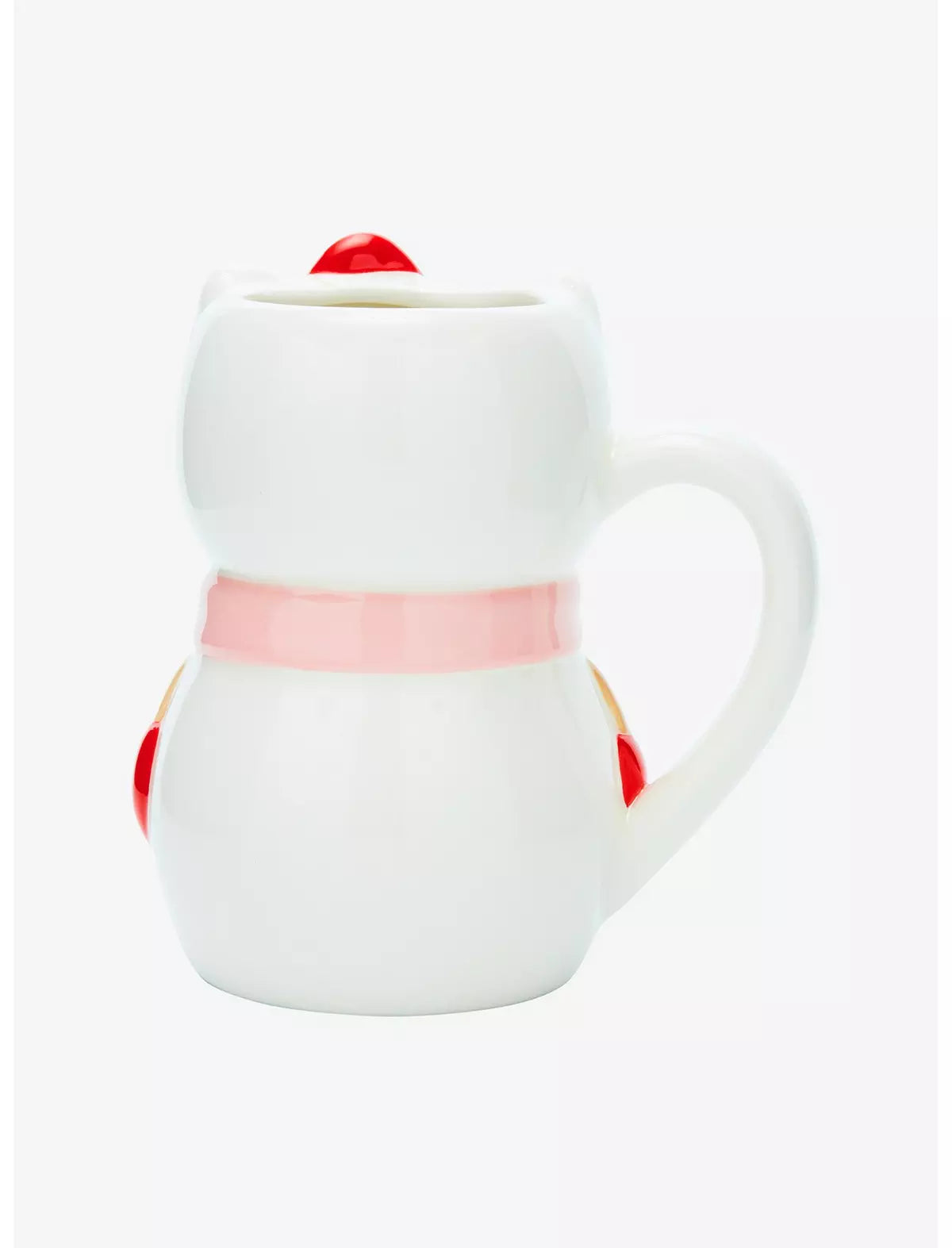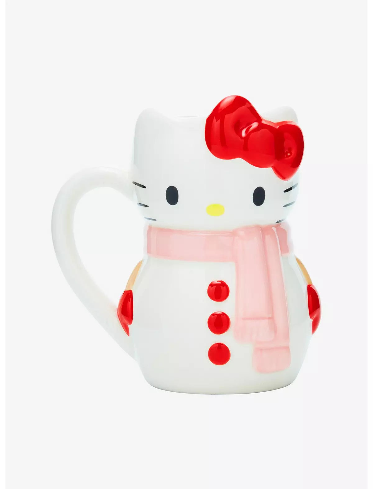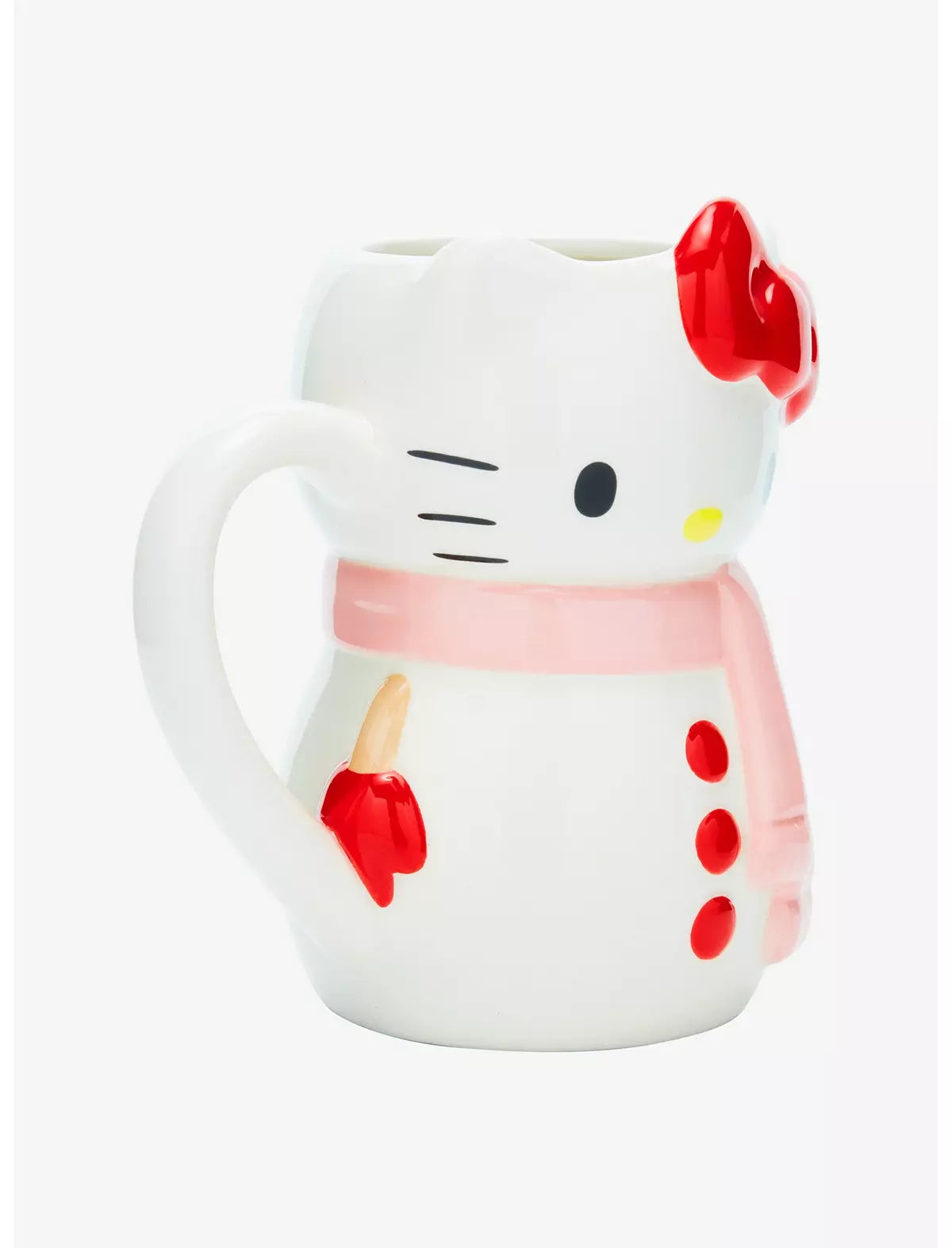 ¡Hello Kitty quiere ayudarte a calentar tus huesos en estas fiestas! Esta taza figurativa la muestra como un muñeco de nieve, completa con botones y guantes rojos, una bufanda rosa y un lazo característico.