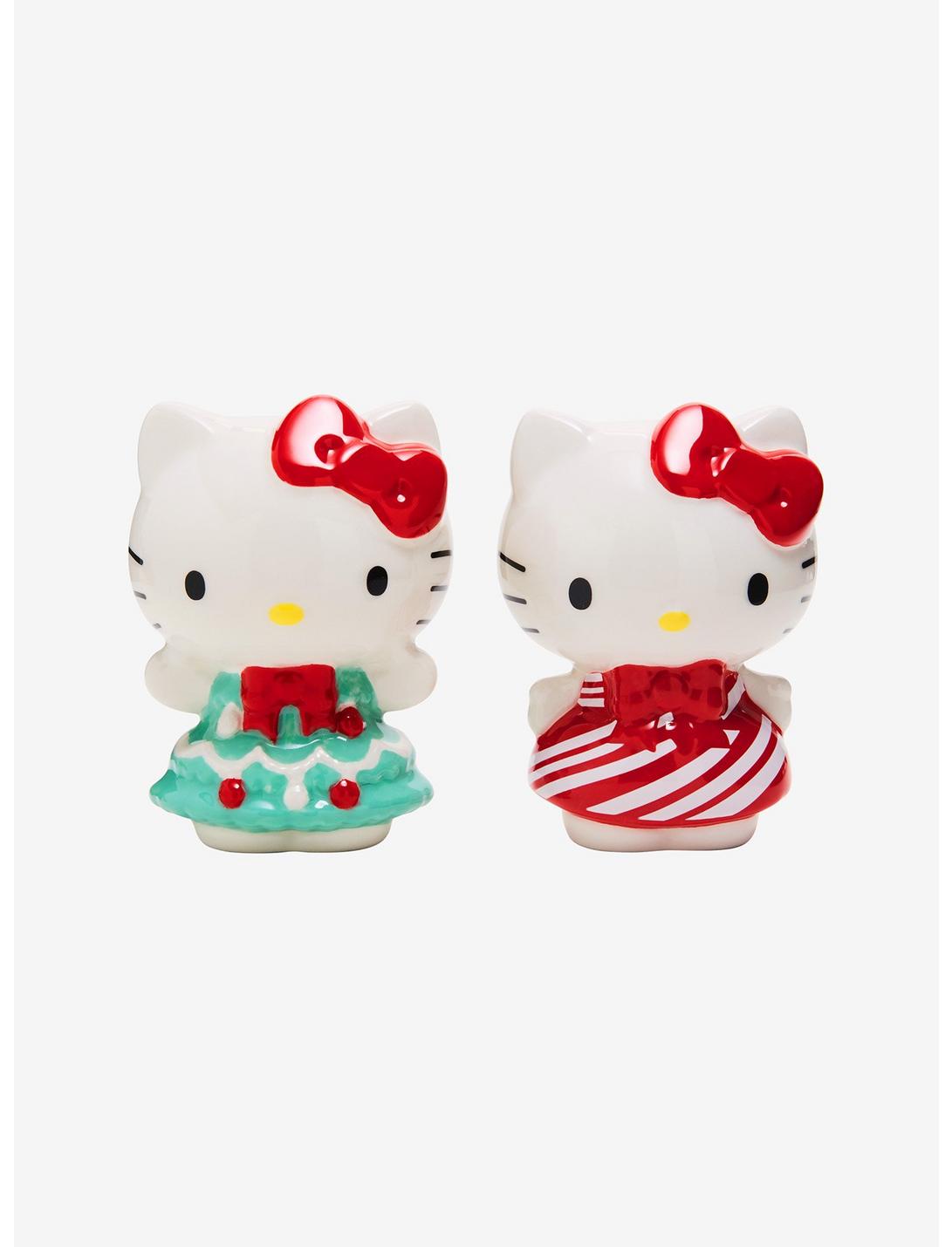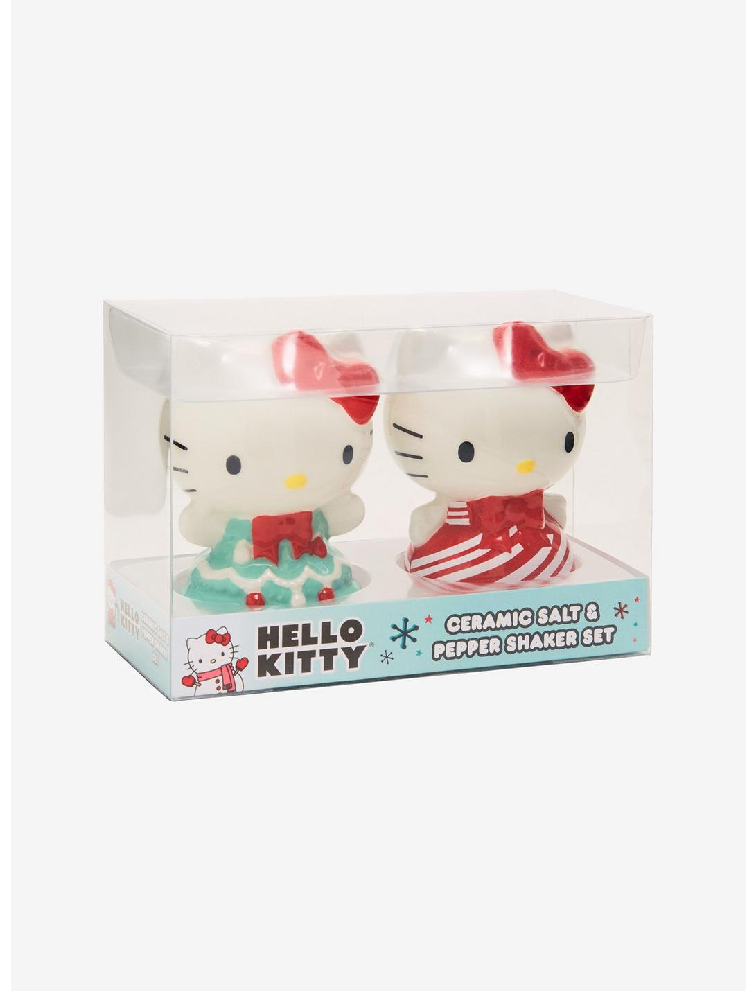 Completa tu mesa con estos saleros y pimenteros de cerámica. Ambos son Hello Kitty; uno la muestra vestida como un árbol de Navidad y el otro con rayas de bastones de caramelo. Los fondos tienen tapones de goma.