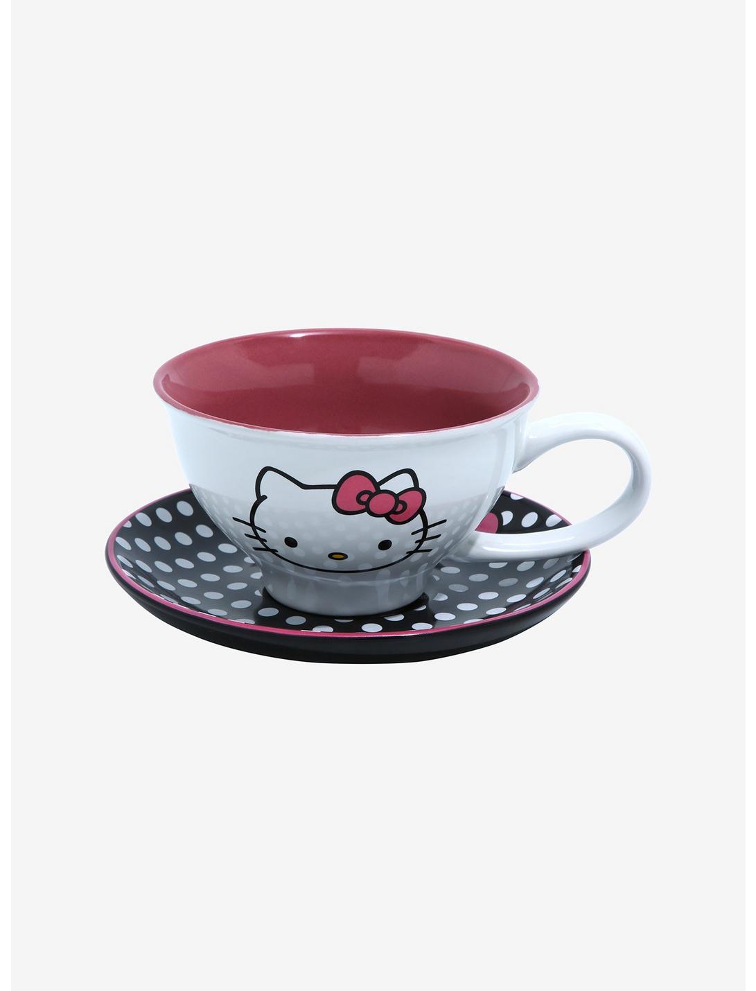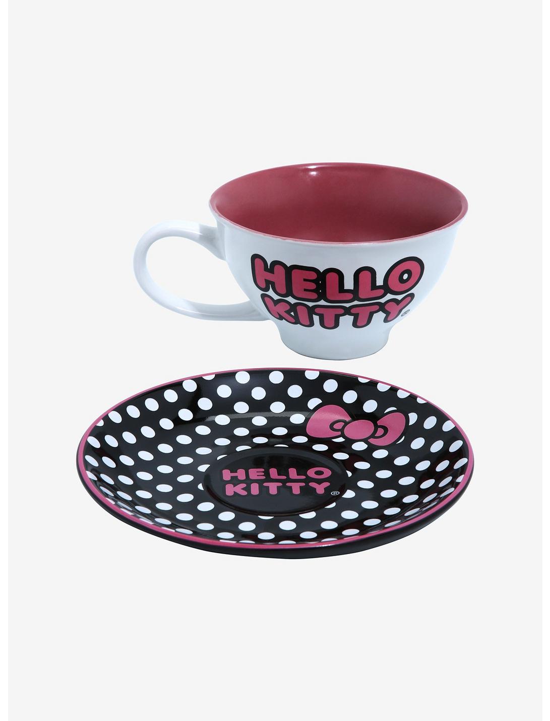 ¡Llévate a casa este elegante juego de taza de té y platillo para una adición moderna a tu colección de vasos! Inspirada en Hello Kitty, la mascota de Sanrio aparece en el frente de esta taza de té con las letras "Hello Kitty" en la parte posterior. El platillo luce un estampado de lunares por toda la prenda con más letras de "Hello Kitty" y su característico lazo rosa. ¡Ahora puedes compartir un brindis con un amigo de Sanrio cada vez que uses este juego de vasos!
