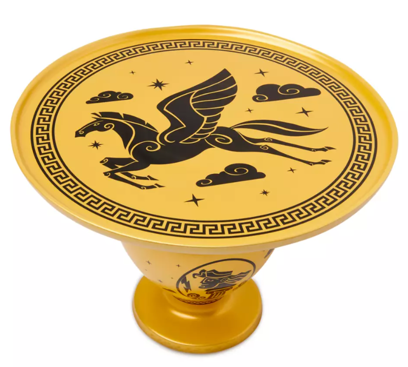 Presente sus pasteles y entremeses de una manera heroica con este pedestal de estilo griego dorado con un patrón arcaico de Hércules y Pegaso.