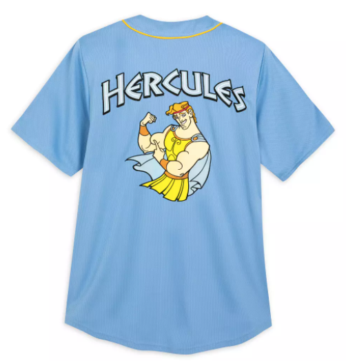 Pasa de cero a héroe con esta camiseta de béisbol de estilo tradicional con un toque mítico de Disney. Los apliques bordados y los diseños de los personajes de Hércules impactan tanto en la parte delantera como en la trasera.