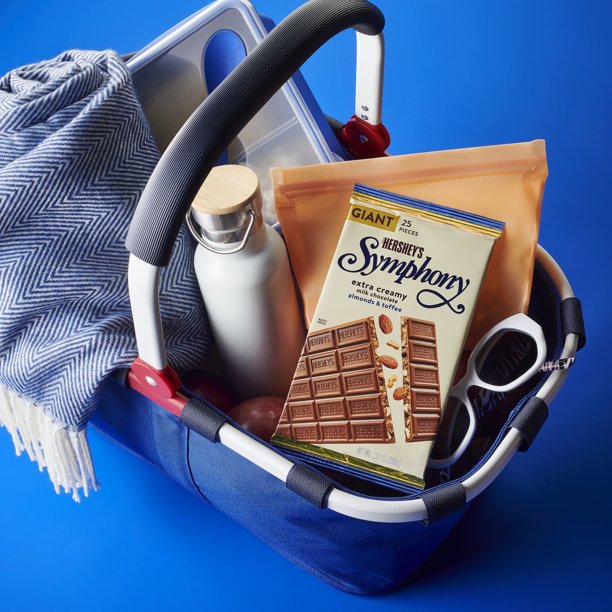 Contiene una (1) barra de caramelo gigante HERSHEY'S SYMPHONY extra cremosa de chocolate con leche, almendras y caramelo de 25 piezas de 7.37 onzas