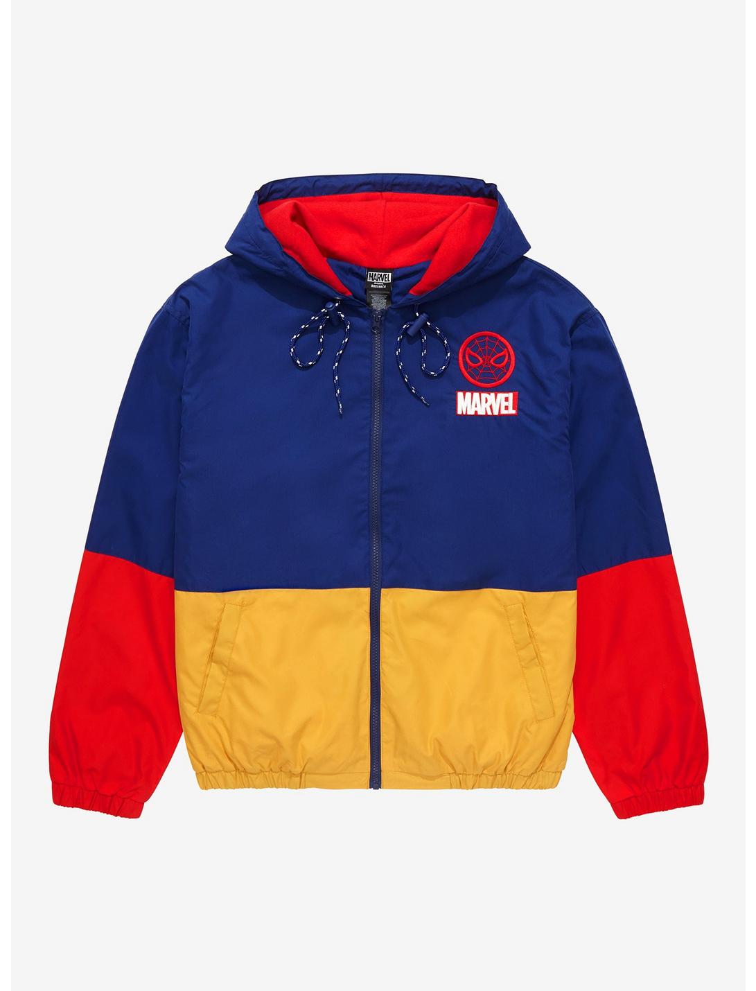 ¡Eslinga web como el icónico superhéroe Spider-Man con esta chaqueta de moda! Con un pequeño diseño del logotipo de la cara de Spidey sobre las letras "Marvel" en la parte delantera, la parte posterior de esta chaqueta de bloques de colores presenta un arte estilo boceto del héroe entre bordado "Hang in There" y "A Message From Your Neighborhood Spider-Man". "letras. También cuenta con una capucha acogedora, sujetadores de capucha con cordón y bolsillo.