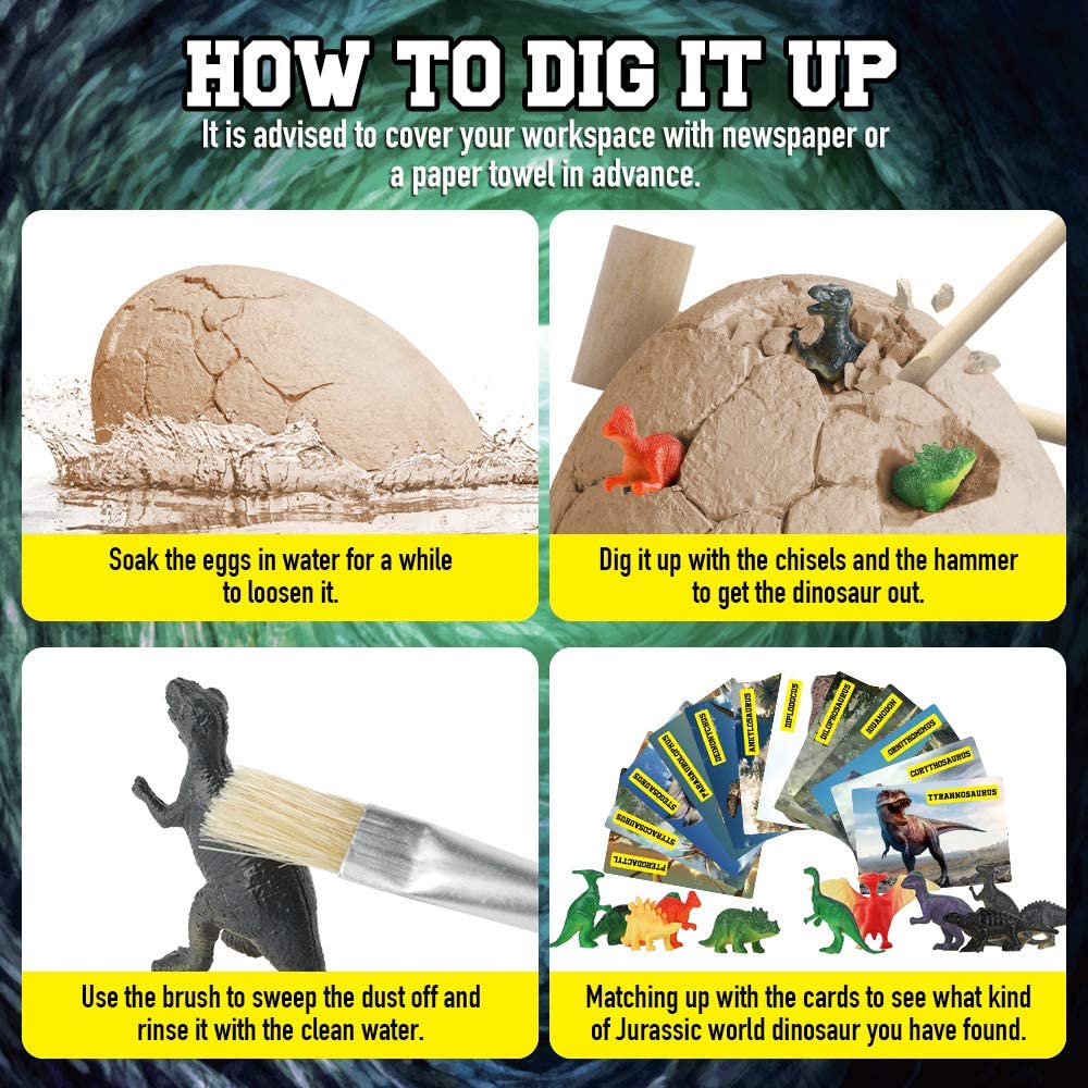- 🔧Cómo excavarlo: Para ensuciarse un poco con el kit de excavación de huevos de dinosaurio, te sugerimos poner algunos manteles en la mesa primero o hacerlo afuera. Para empapar los huevos de dinosaurio en agua en 10 minutos, y excavar con los cinceles y martillos y barrer el polvo con el cepillo. A continuación, enjuaga el dinosaurio con agua limpia y obtendrás ¡un bonito y hermoso juguete! Para jugar con los juguetes y aprender con las tarjetas de identificación, para ver qué tipo de dinosaurio del mundo jurásico encontraron los niños.