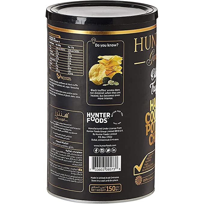 Patatas fritas cocinadas a mano Hunter's Gourmet - Trufa negra - Colección de trufas (150 g) Bote de 150 g. Patatas fritas, veganas, sin gluten, sin MSG, sin OMG, sin conservantes artificiales, sin colorantes artificiales, sin grasas trans, sin colesterol, Halal, sin lácteos, sin lactosa.