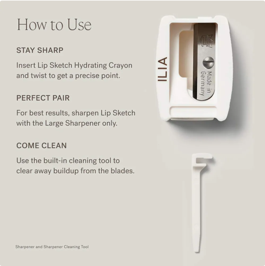 Lo que debes saber: Afila tu Lip Sketch Hydrating Crayon (se vende por separado) para obtener un punto limpio y preciso con este sacapuntas diseñado a medida. Fabricado con plástico 100 % reciclado y acero inoxidable, e incluye una herramienta de limpieza incorporada, es el complemento perfecto para tu Lip Sketch Hydrating Crayon.