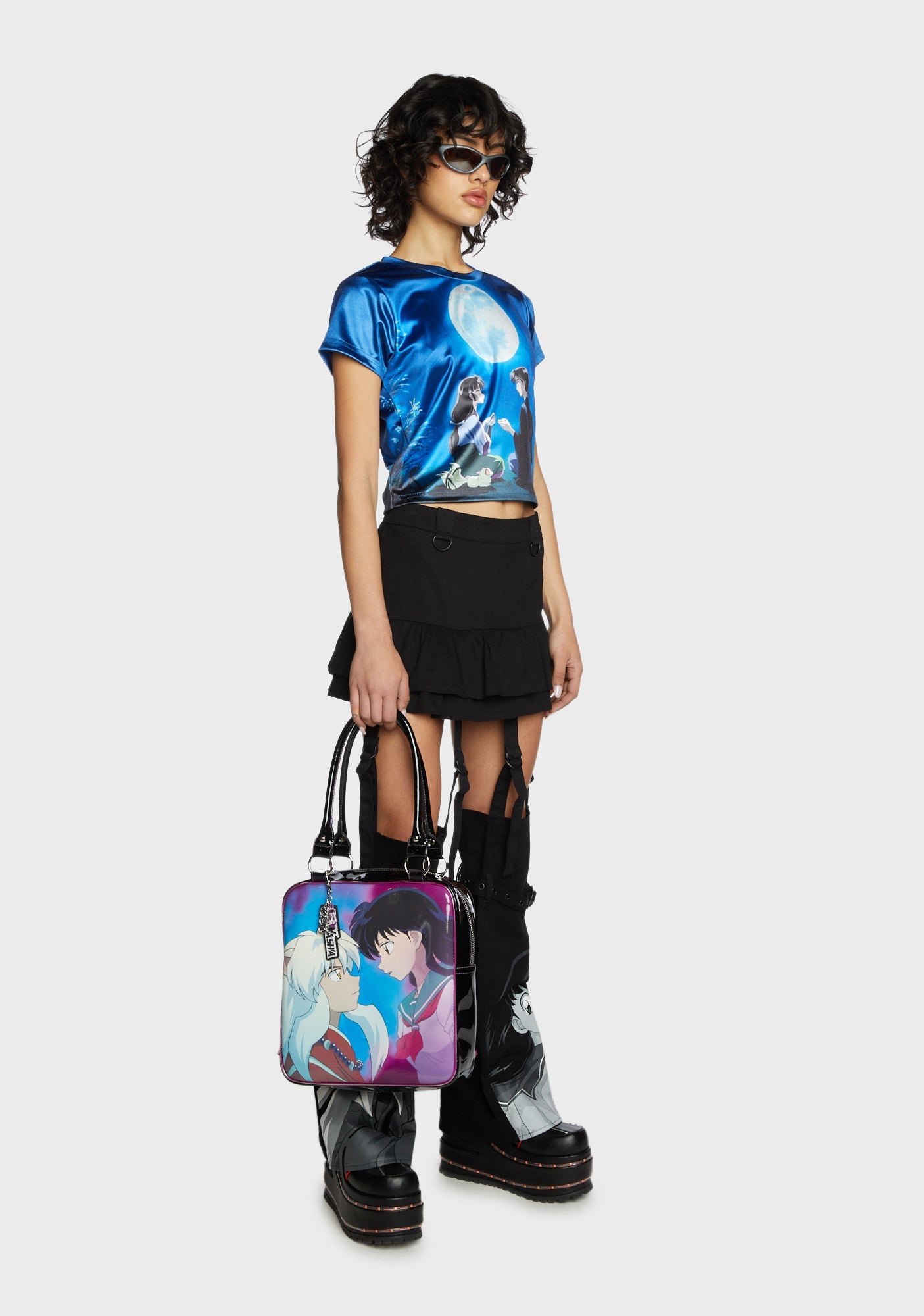 You Feel Me Light Up Bag porque nuestros corazones laten como uno solo. Este bolso tiene una construcción de charol vegano, asas superiores, un gráfico de Inuyasha y Kagome en el frente, el logotipo de Inuyasha en la parte posterior, cremallera interior y bolsillos de parche, un cierre de cremallera superior con un colgante de llavero desmontable, ¡y se ilumina!