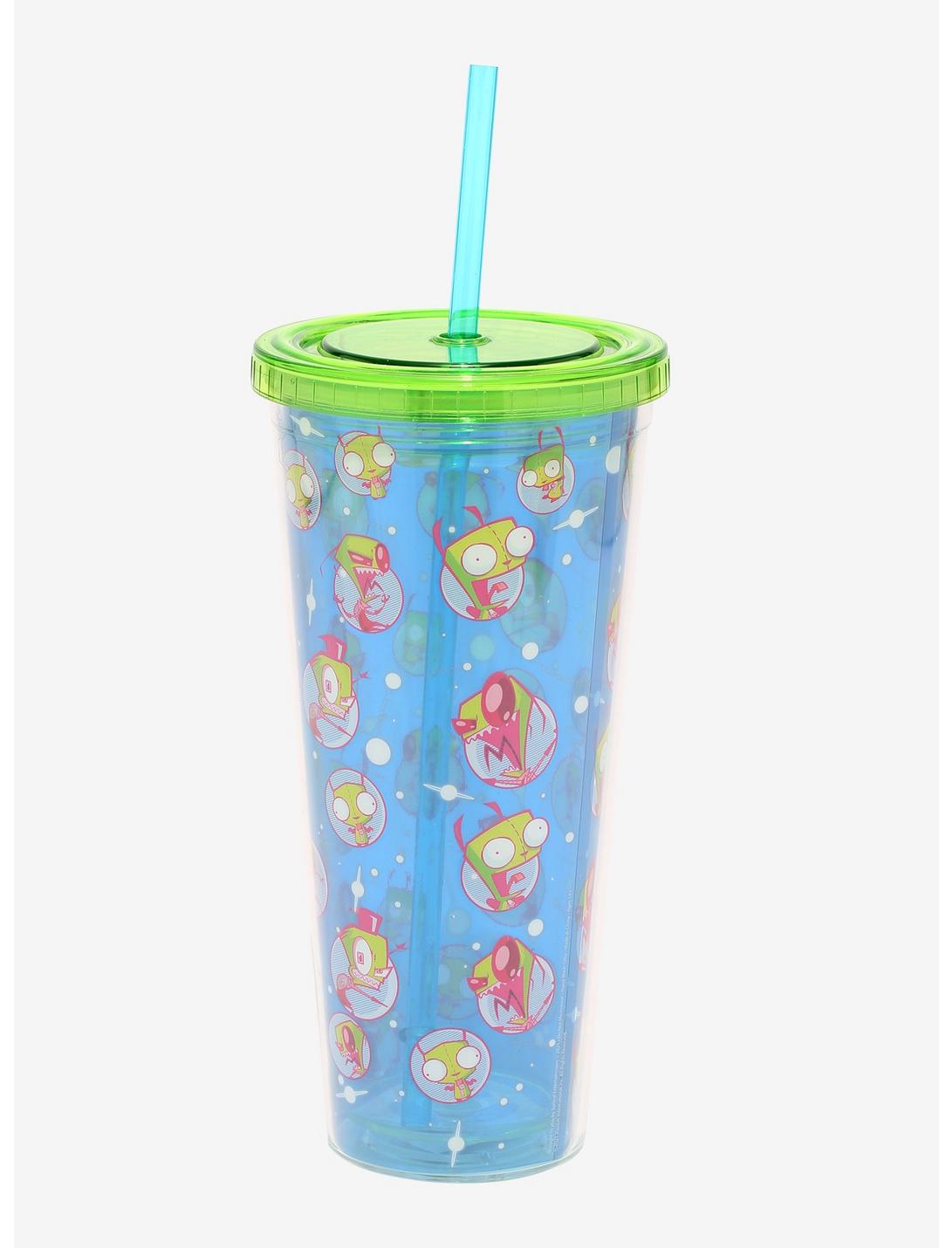 ¡Cantar "The Doom Song" durante 6 meses seguidos definitivamente te dará sed! ¡Hidrátate antes de tu bis con este vaso de viaje de Invader Zim! El diseño azul neón y verde presenta un estampado de GIR y Zim en círculos, rodeados de estrellas y planetas.