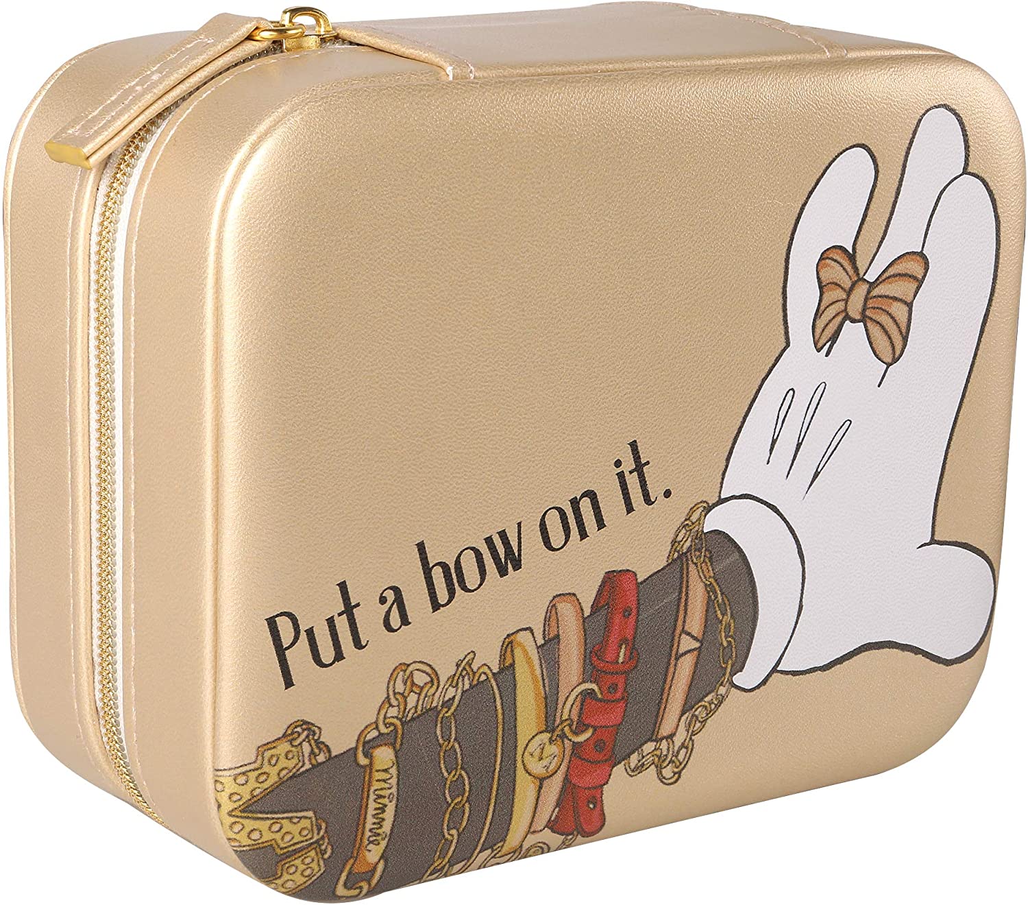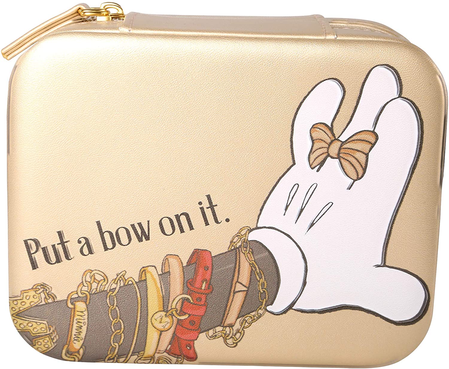 - Fabuloso organizador de joyas en dorado mate con "Put a bow on it" y Minnie muestra su lazo como anillo
