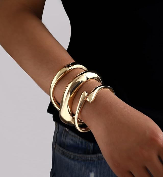 Brazaletes llamativos: Con un diámetro de 6 cm (2.36") y anchos de 17 mm (0.66"), 5 mm (0.19") y 5 mm (0.19"), estos brazaletes destacan como pieza central en cualquier look. Circunferencia interna: 17.5 cm (6.88").