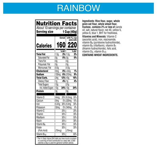 Incluye una caja familiar de 17.8 oz de cereal Rainbow Krispies; Empaquetado para frescura y gran sabor.