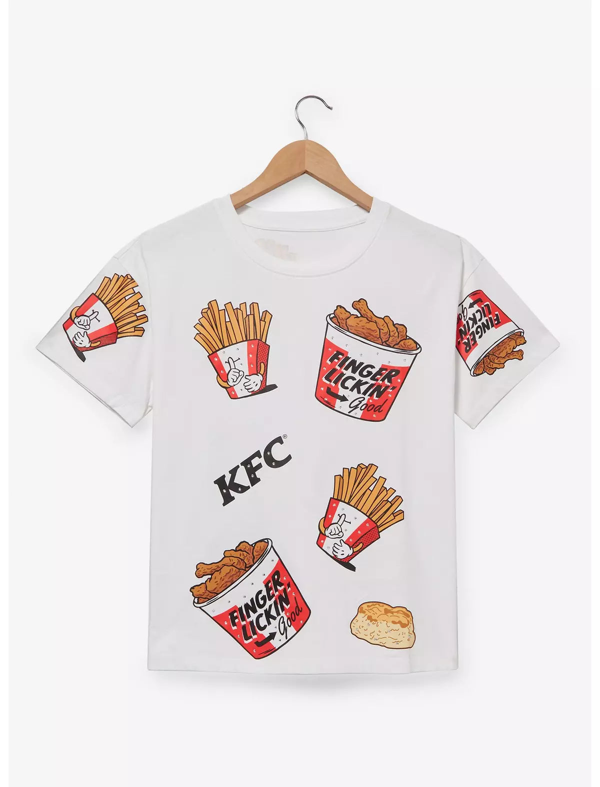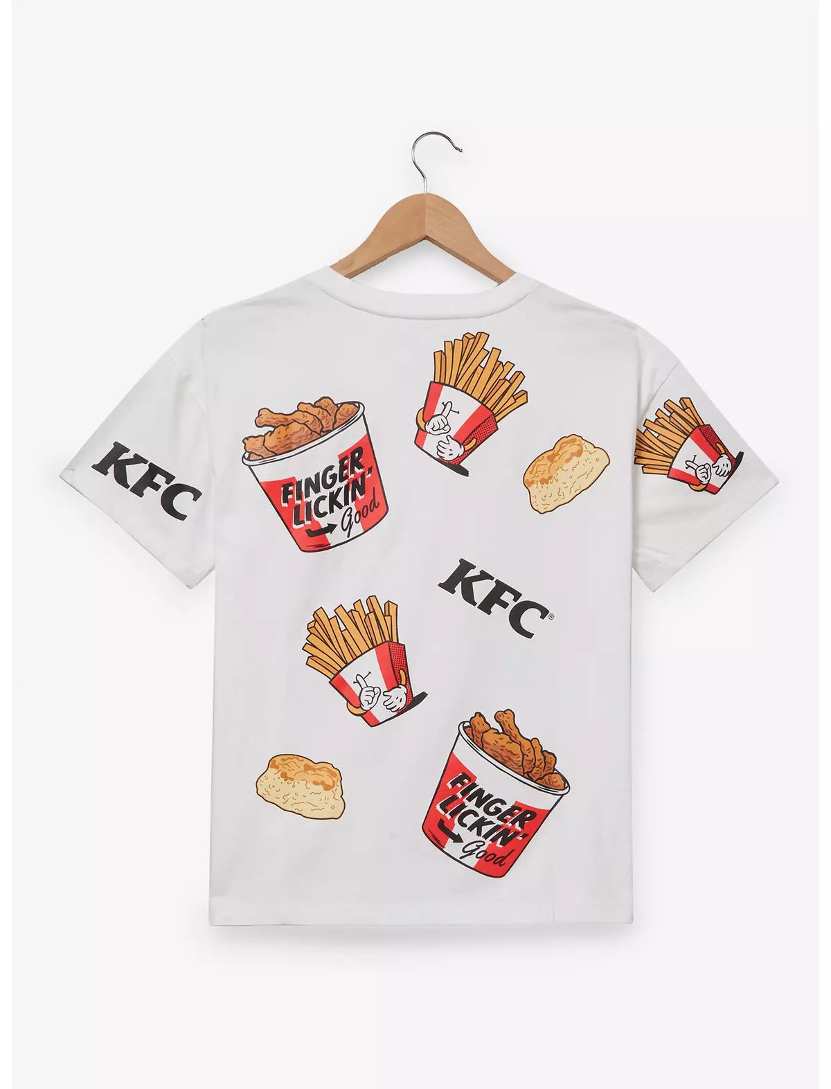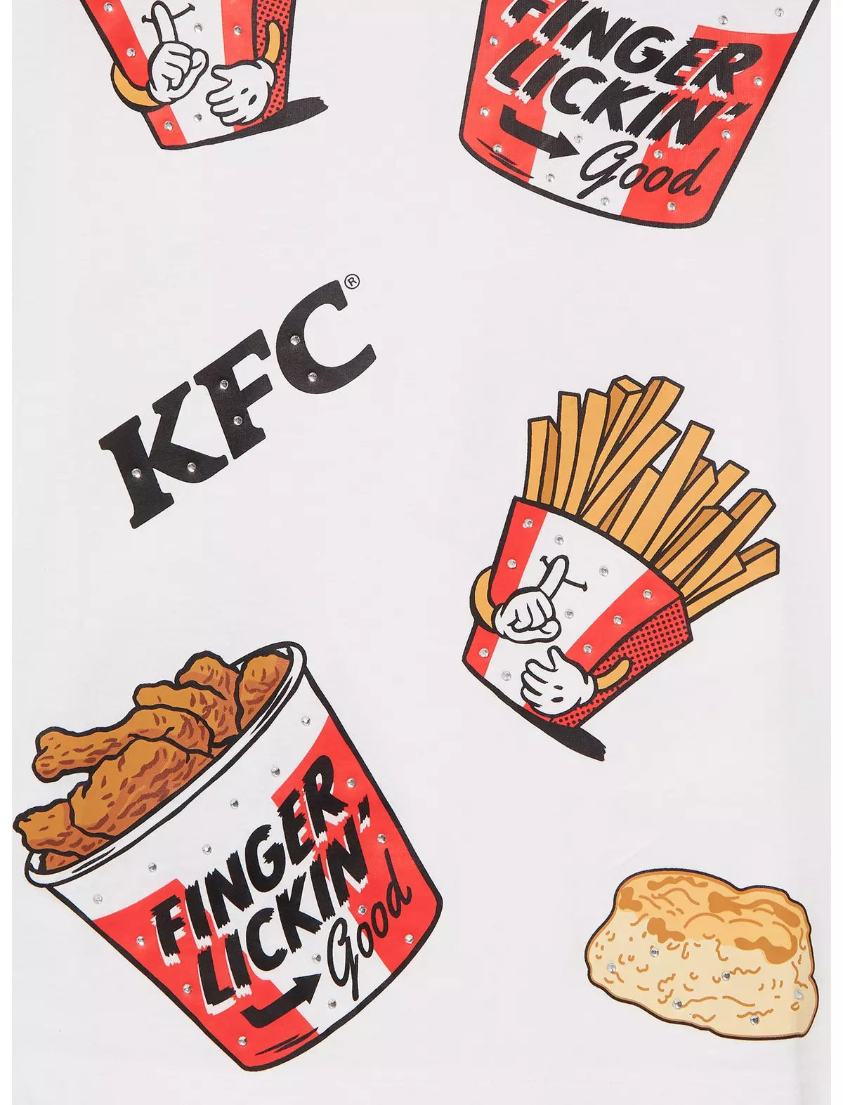 ¡Agrega un poco de sabor a tu guardarropa con esta camiseta inspirada en Kentucky Fried Chicken! Esta camisa, que presenta un estampado integral de cubos de pollo, papas fritas, galletas y las letras "KFC", incluye detalles de diamantes de imitación en la parte delantera. Con un corte cuadrado, esta camisa es perfecta para tu próxima cena o almuerzo.