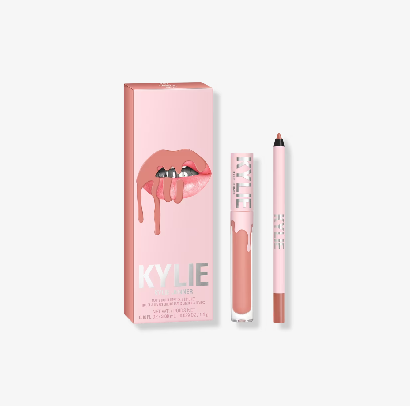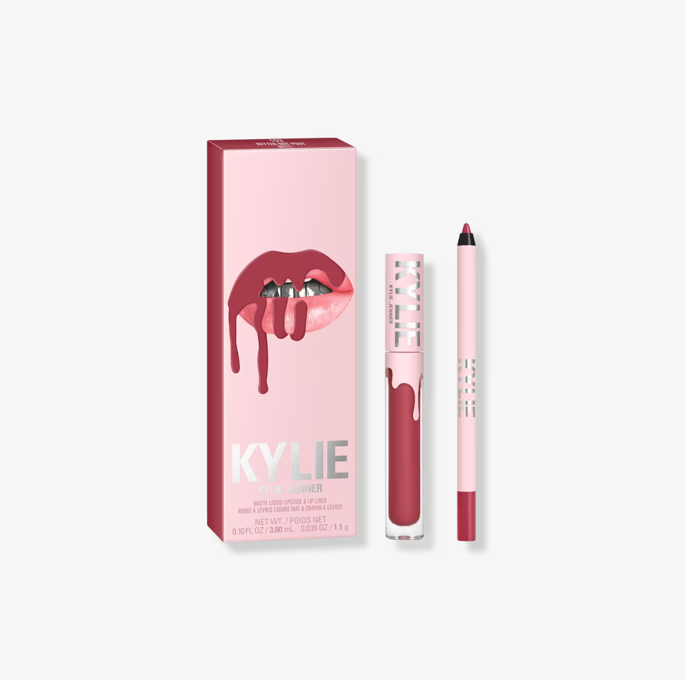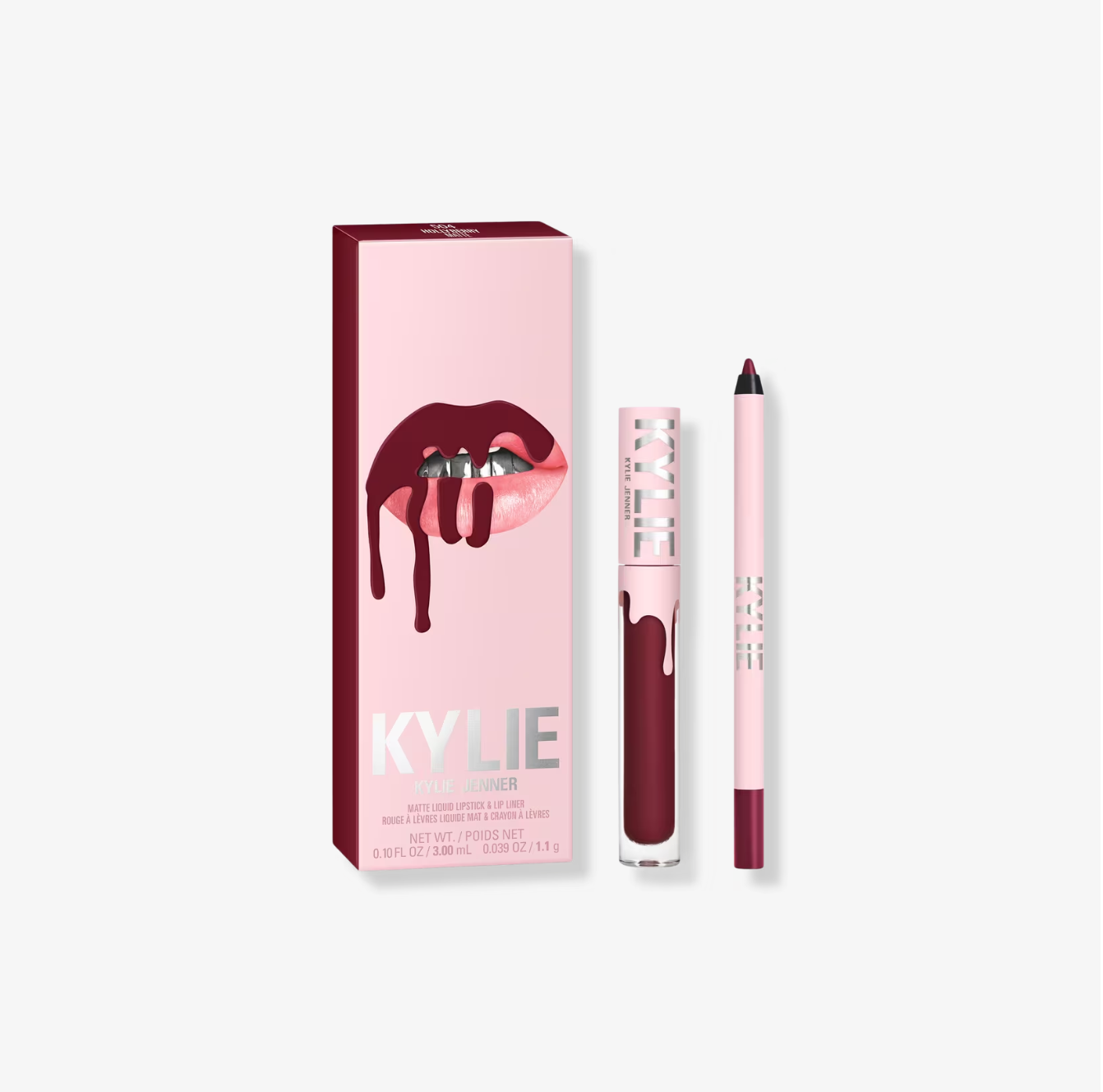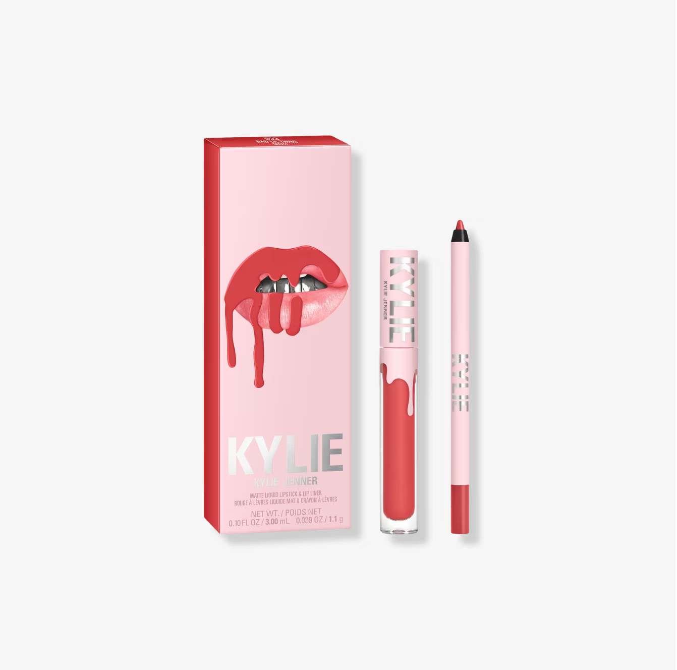 El Matte Lip Kit de KYLIE COSMETICS permite crear labios mate de larga duración como los de Kylie. Este dúo incluye un Matte Liquid Lipstick y un Lip Liner, altamente pigmentados y veganos, listos para un acabado profesional.