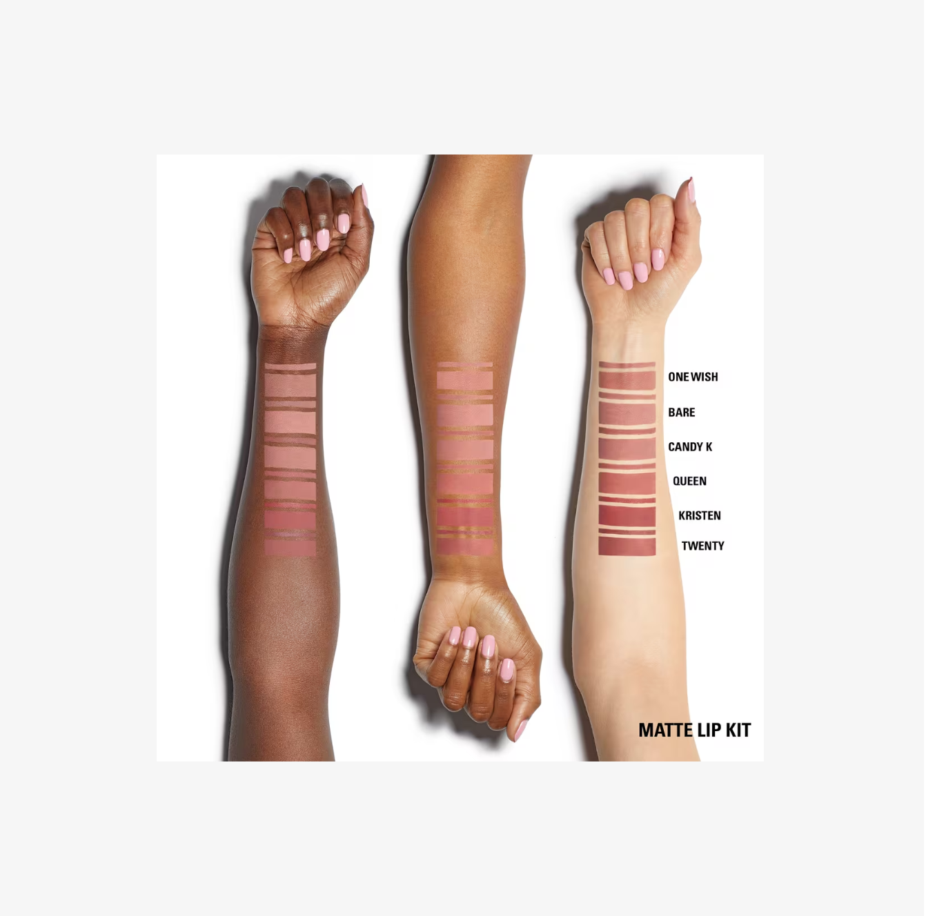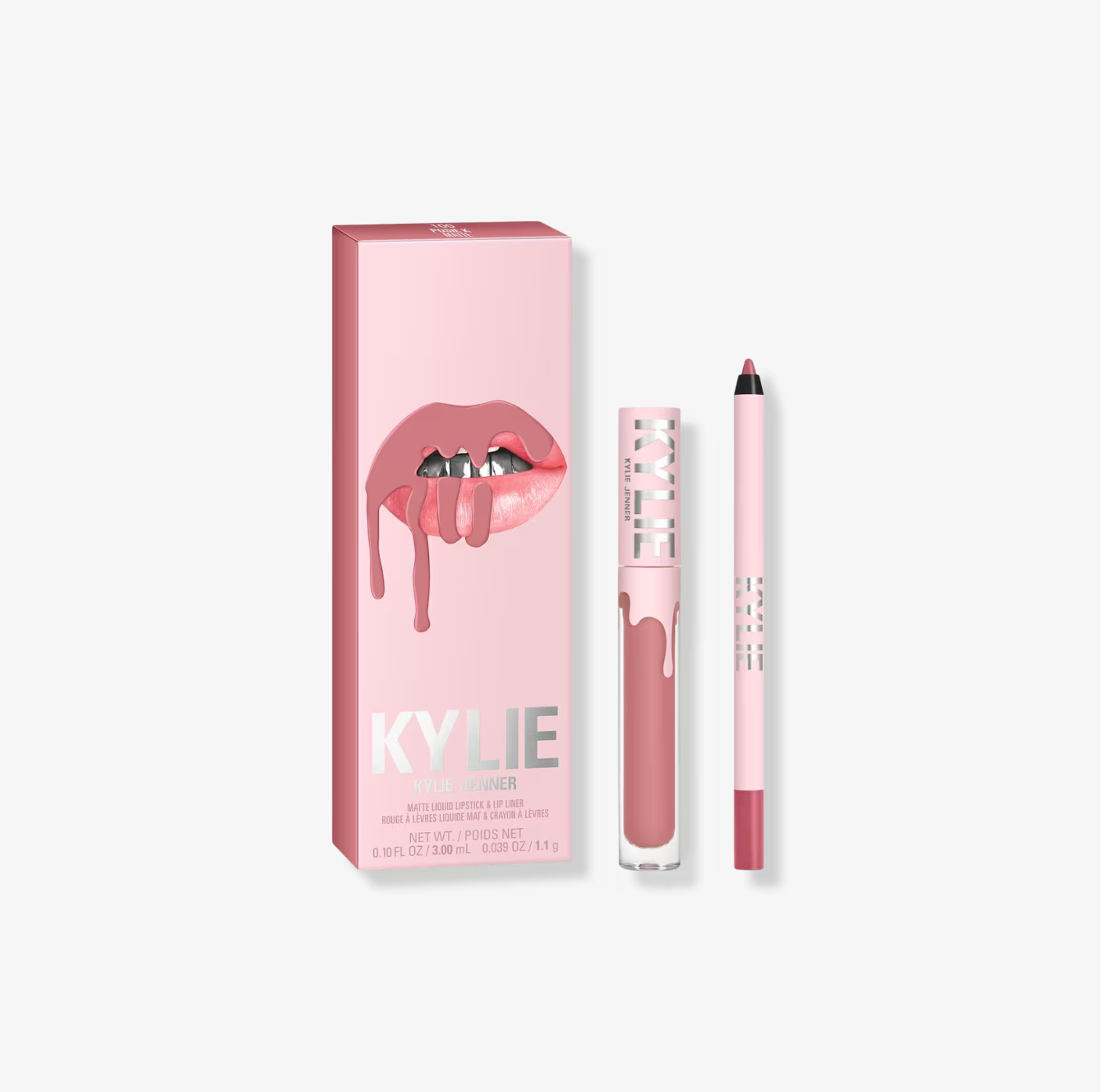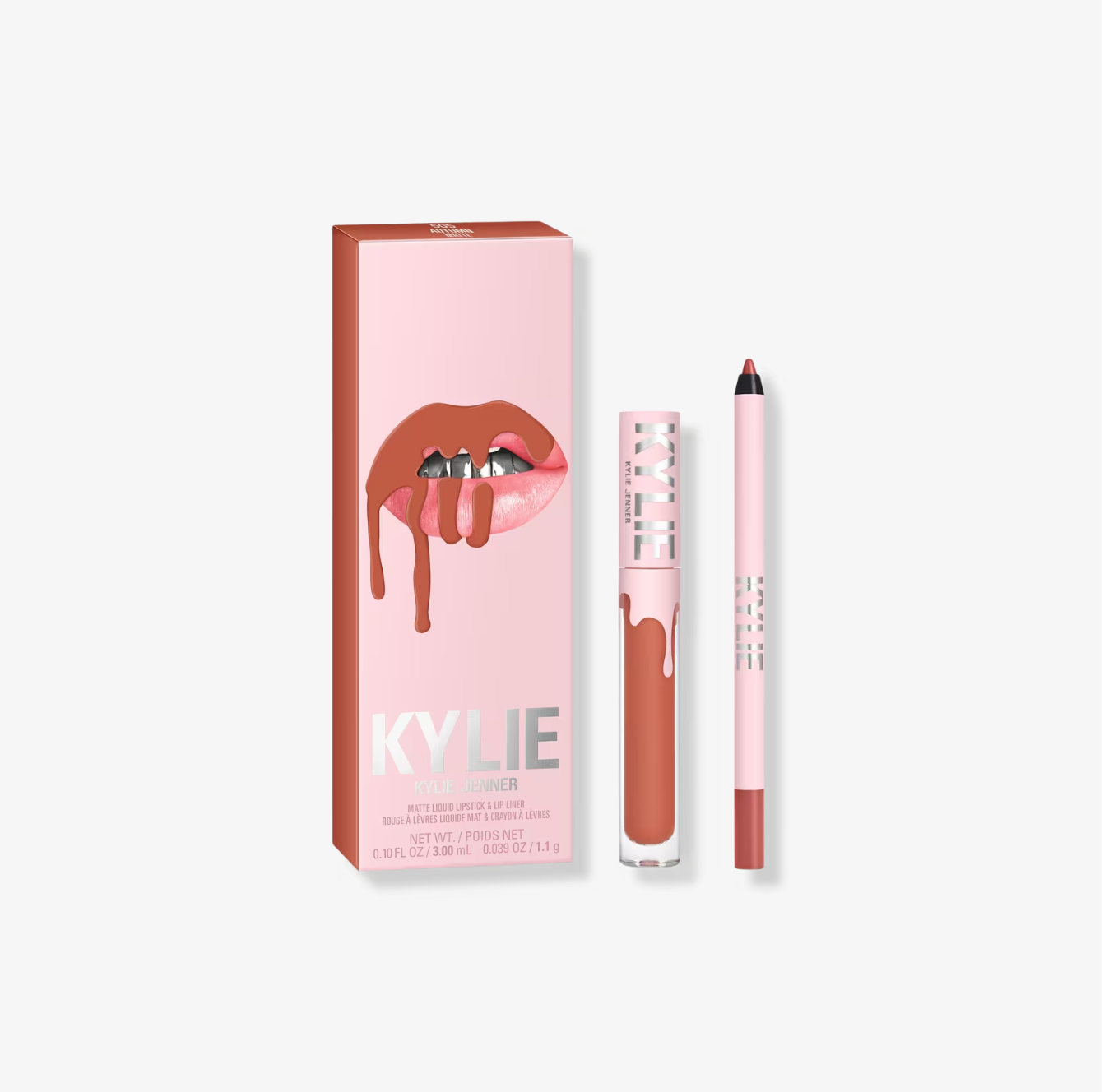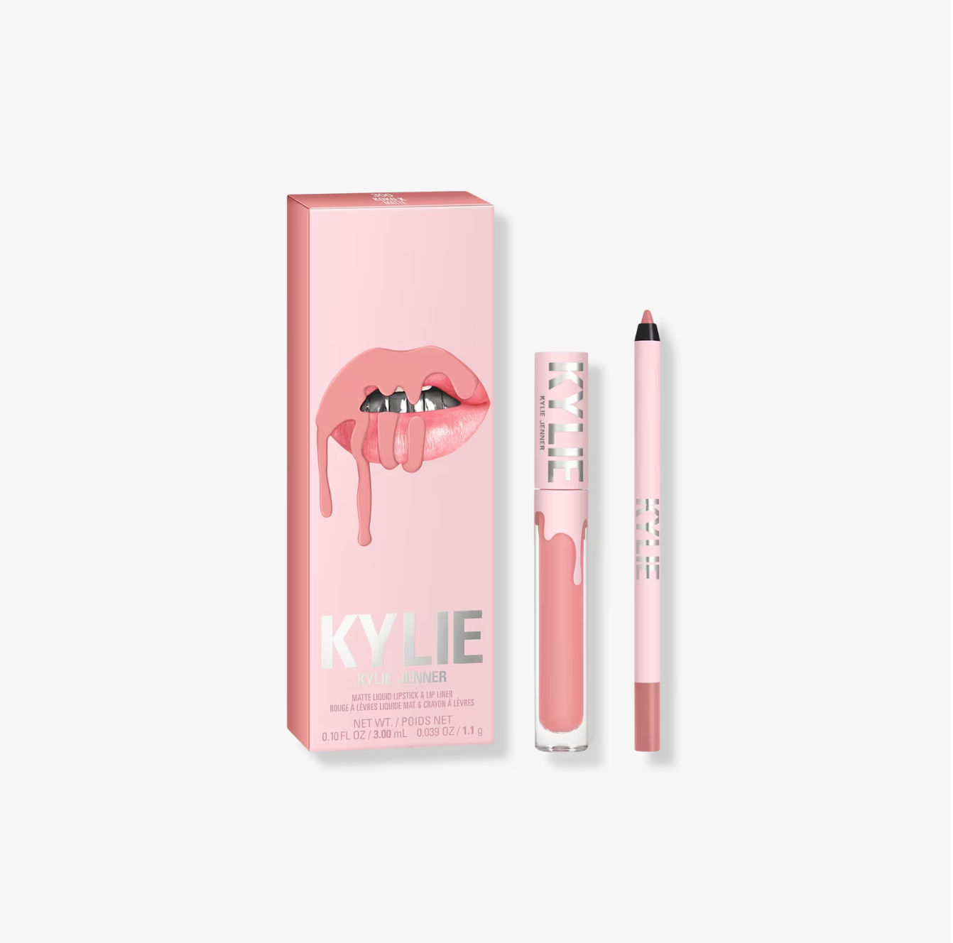 El Matte Lip Kit de KYLIE COSMETICS permite crear labios mate de larga duración como los de Kylie. Este dúo incluye un Matte Liquid Lipstick y un Lip Liner, altamente pigmentados y veganos, listos para un acabado profesional.