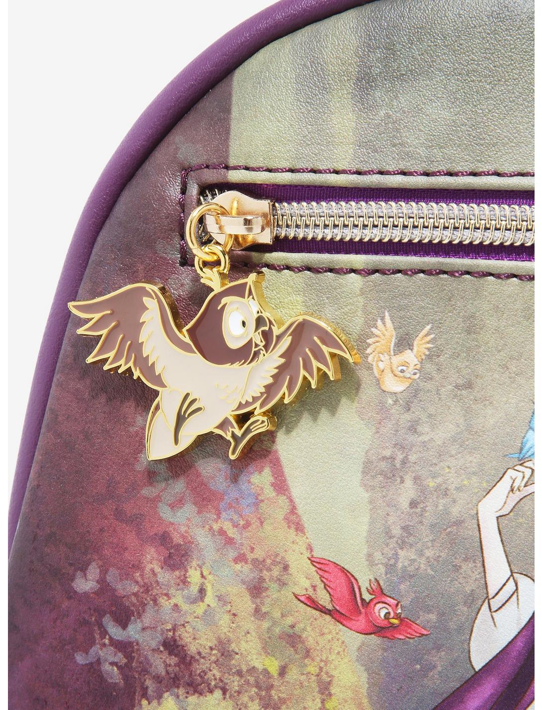 ¡Estamos bastante seguros de que hemos visto esta mini mochila alguna vez en un sueño! Este bolso de La Bella Durmiente presenta el momento icónico del cuento ilustrado de una manera completamente nueva. Con Aurora bailando el vals por el bosque, además de un amuleto del búho con el que baila en la cremallera del bolsillo delantero. Tirantes ajustables, bolsillo interior colgante y herrajes dorados.