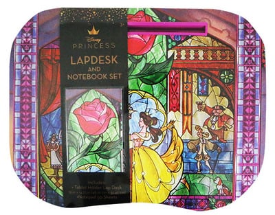 Juego de escritorio y cuaderno de regazo con vitrales de La Bella y la Bestia. Contiene un soporte para tableta y un bloc de notas rayado de 50 páginas.