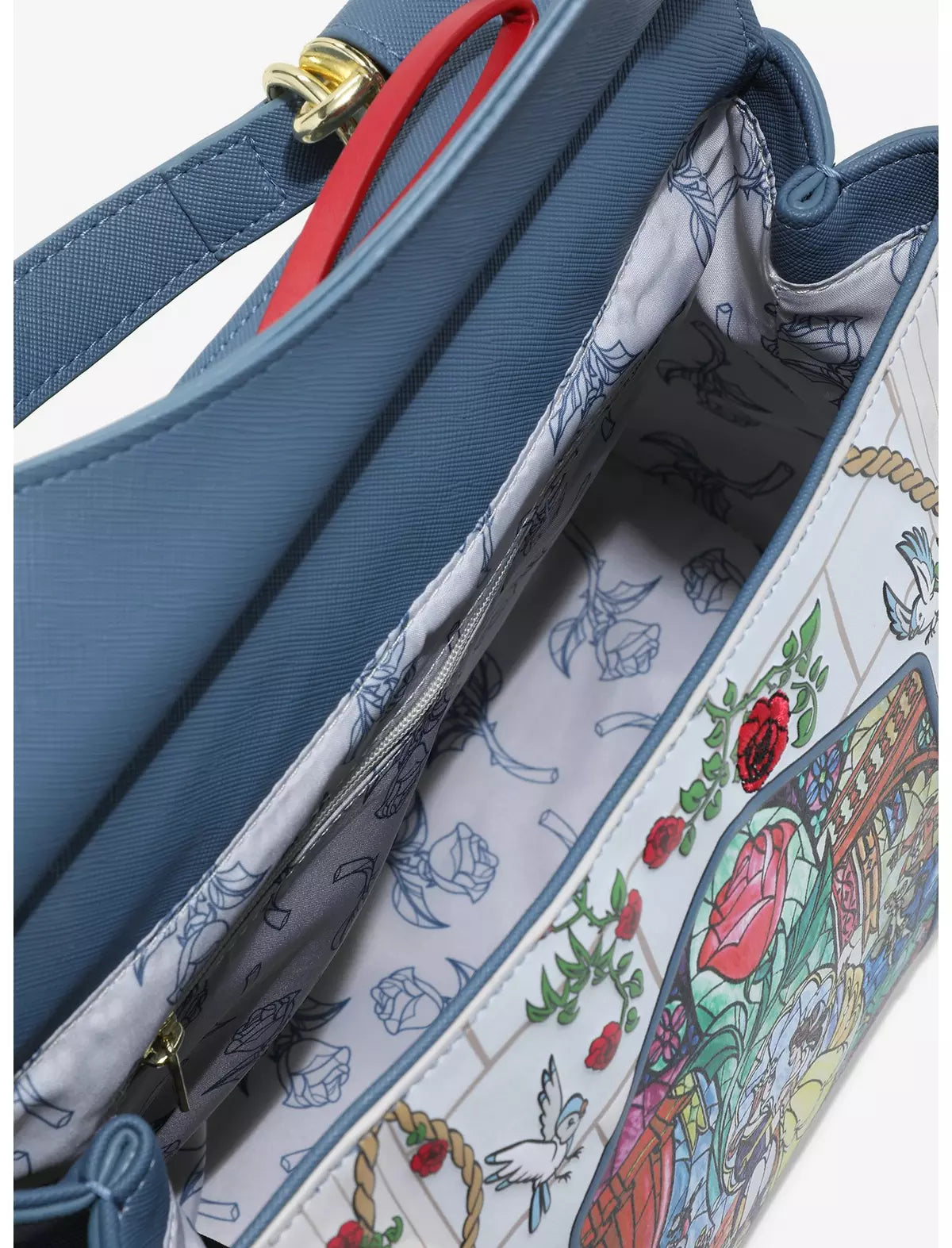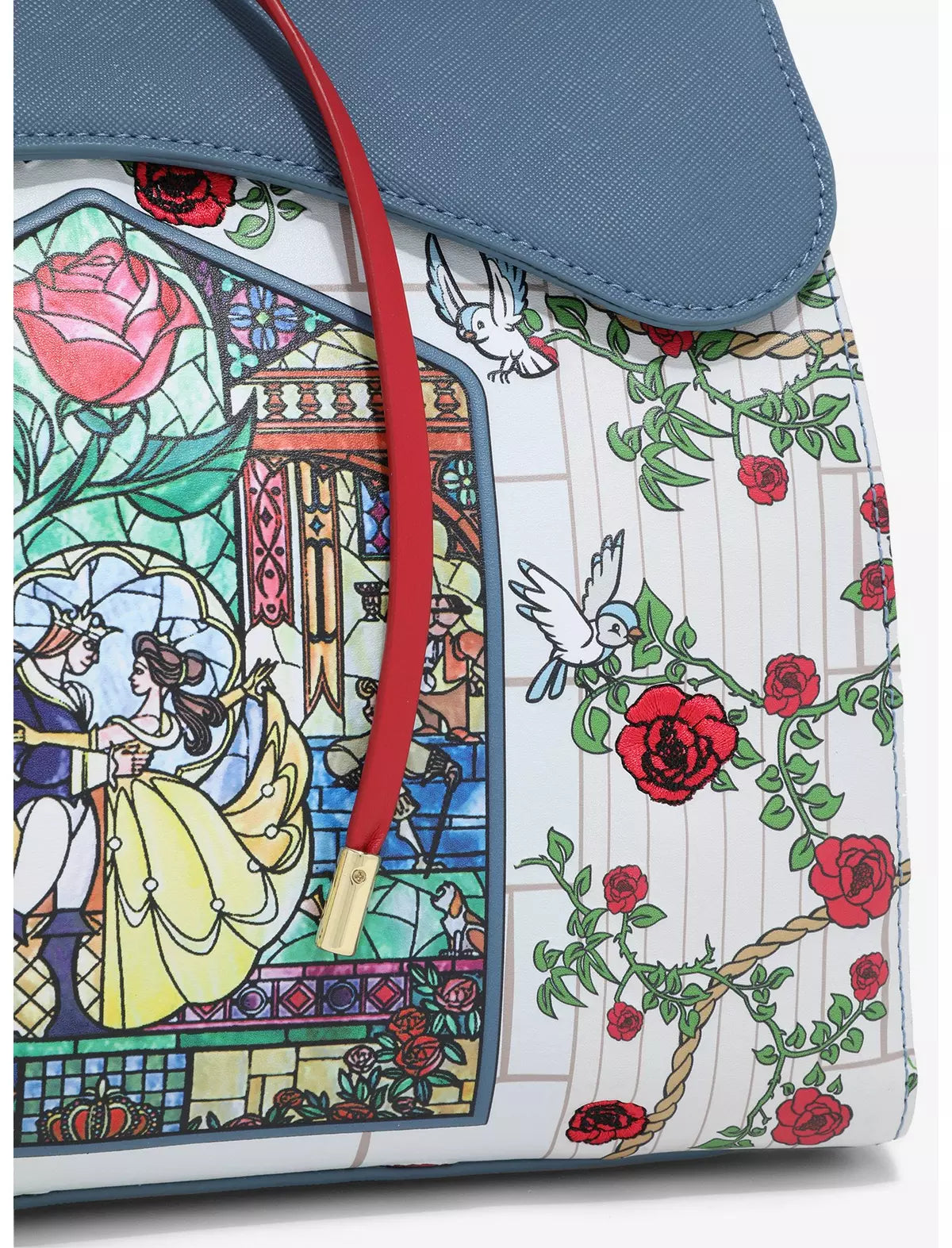 ¡Lleva la historia tan antigua como el tiempo con este precioso bolso de La Bella y la Bestia! Inspirado en la secuencia inicial de la película, el vitral de Bella y la Bestia está rodeado de rosas bordadas. Con un lazo troquelado que adorna el cierre magnético, este bolso también incluye un asa superior y una correa cruzada extraíble. En la parte posterior hay una sencilla rosa bordada que complementa cualquier conjunto con un toque clásico de Disney.