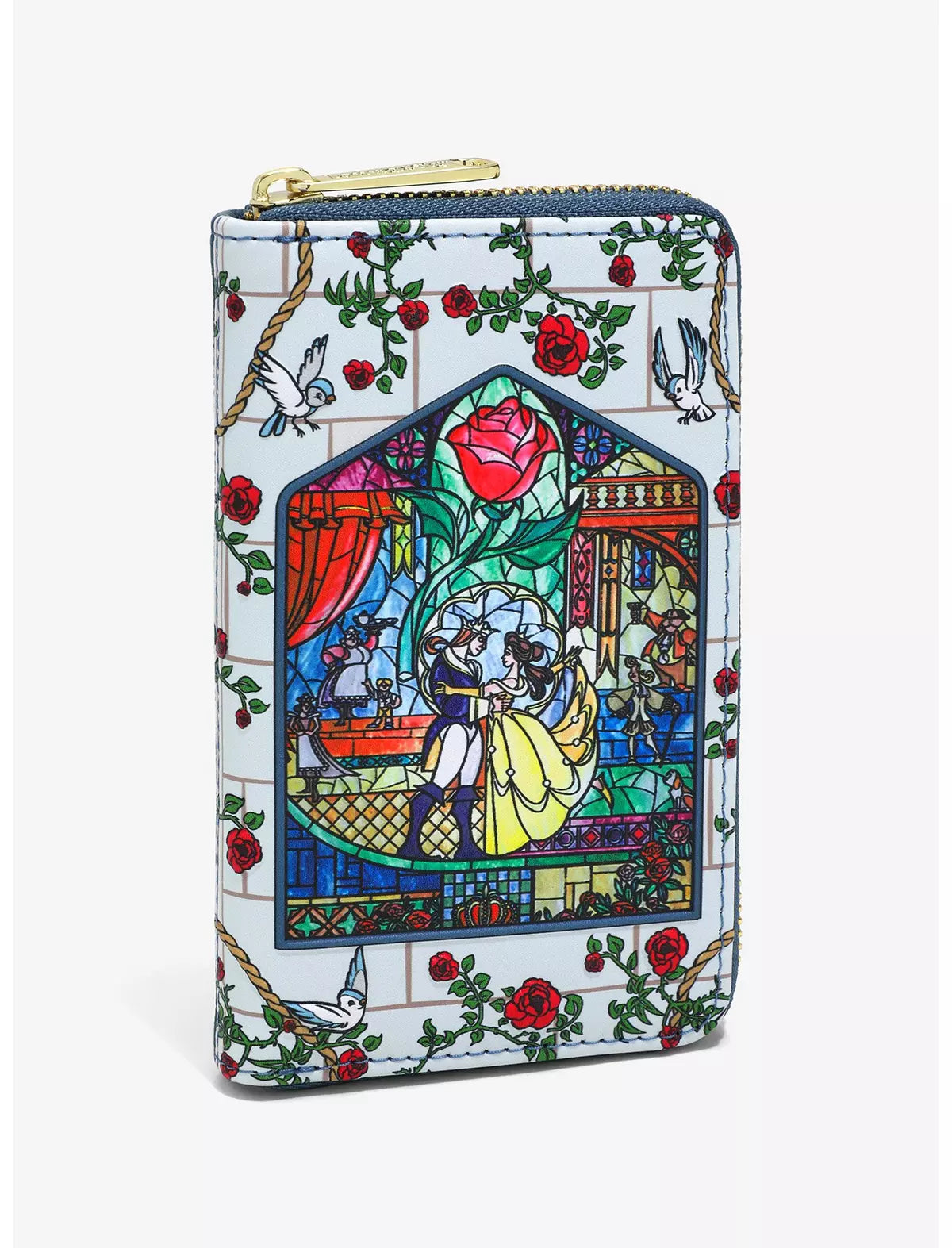 ¡Lleva la historia tan antigua como el tiempo con esta preciosa cartera de La Bella y la Bestia! Inspirado en la secuencia inicial de la película, el vitral de Bella y la Bestia está rodeado de rosas bordadas. En la parte posterior hay una sencilla rosa bordada que complementa cualquier conjunto con un toque clásico de Disney.