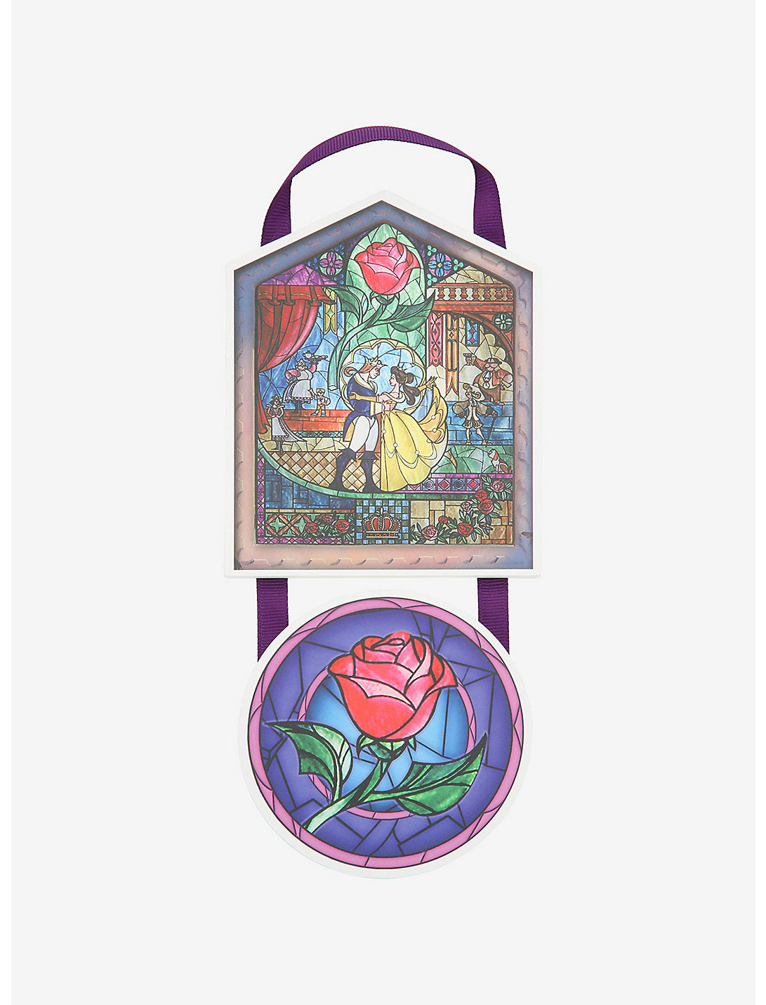 Si la decoración de su hogar se ve un poco bestial, agregue un toque de belleza con este arte de pared colgante de La bella y la bestia. Cuenta con imágenes de estilo vitral de la rosa y de Bella bailando con el príncipe.