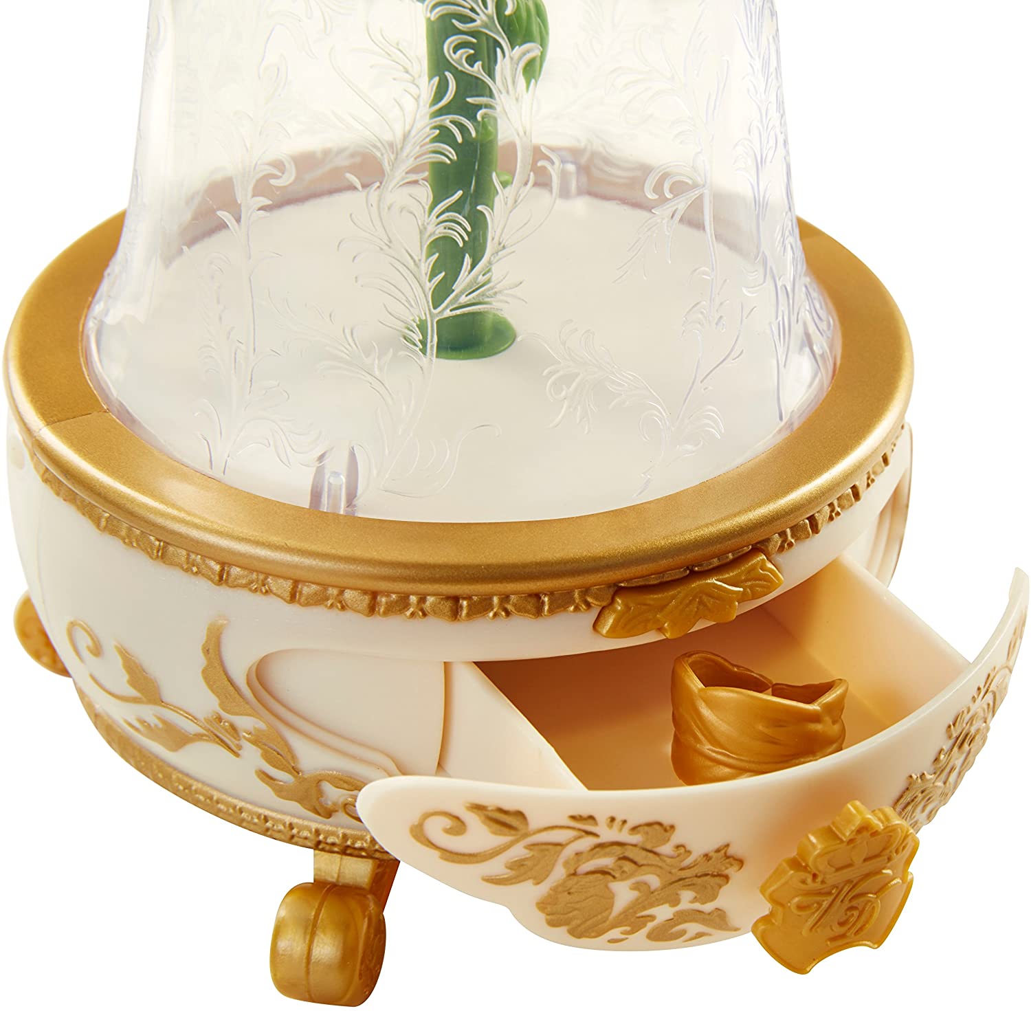 Joyero luminoso con cúpula transparente de filigrana. Tira del cajón en la base para ver la flor de la rosa encantada y la iluminaciónReproduce la melodía del título de la Bella y la Bestia cuando se abre. Incluye accesorio 'anillo de plumas'Inspirado en la película de acción en vivo de Disney Beauty and the Beast