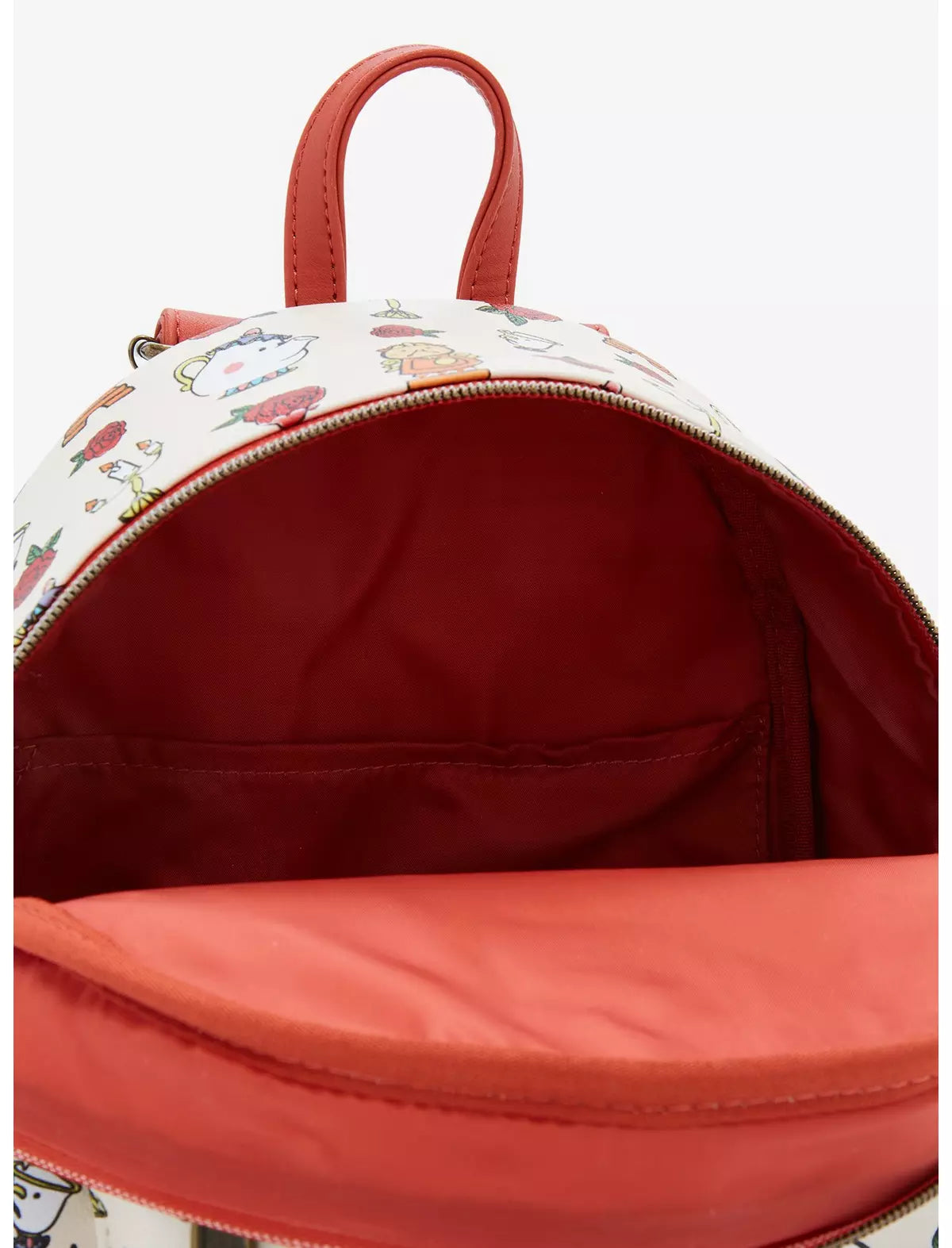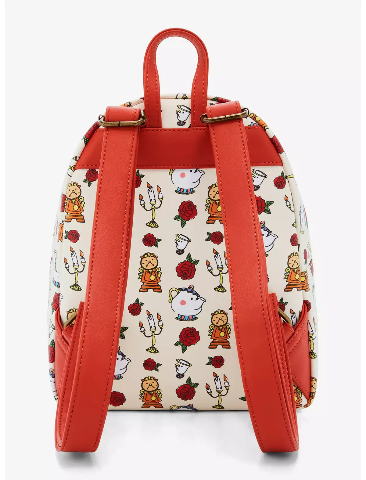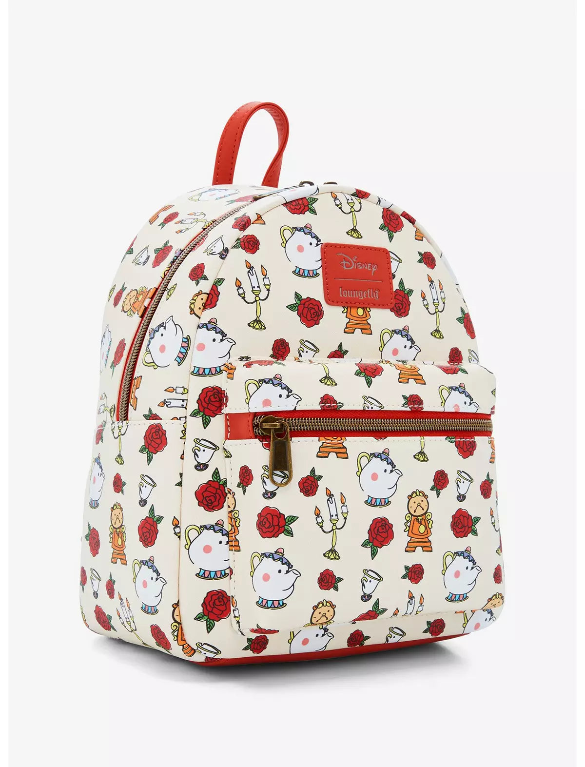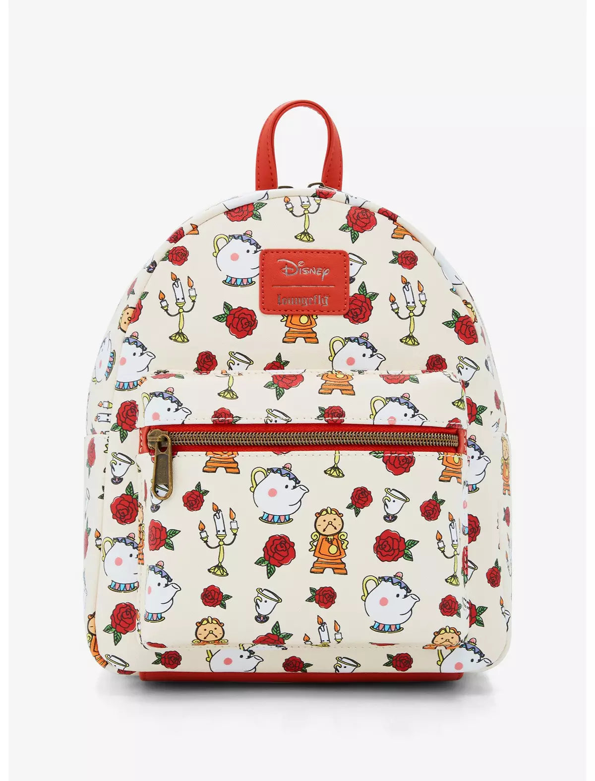¡Tus compinches favoritos de La Bella y la Bestia de Disney aparecen en esta mini mochila con estampado integral! Se presentan versiones chibi de Chip, la Sra. Potts, Lumiere y Cogsworth, así como rosas. Bolsillo frontal con cremallera, tirantes ajustables y bolsillo interior.