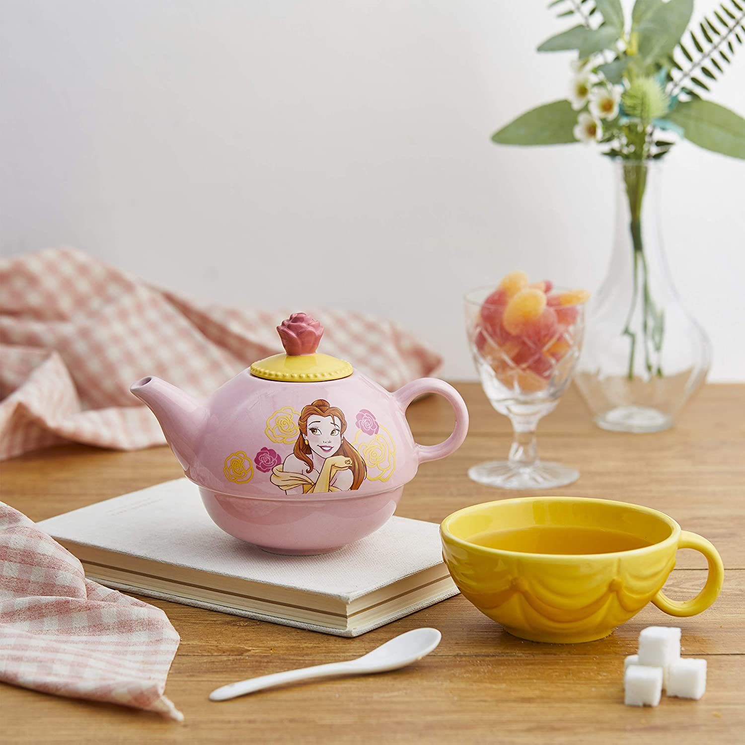 - Diseño único: la tetera, la tapa y la taza de té tienen elegantes patrones esculpidos y divertidas obras de arte con Belle de la Bella y la Bestia de Disney.