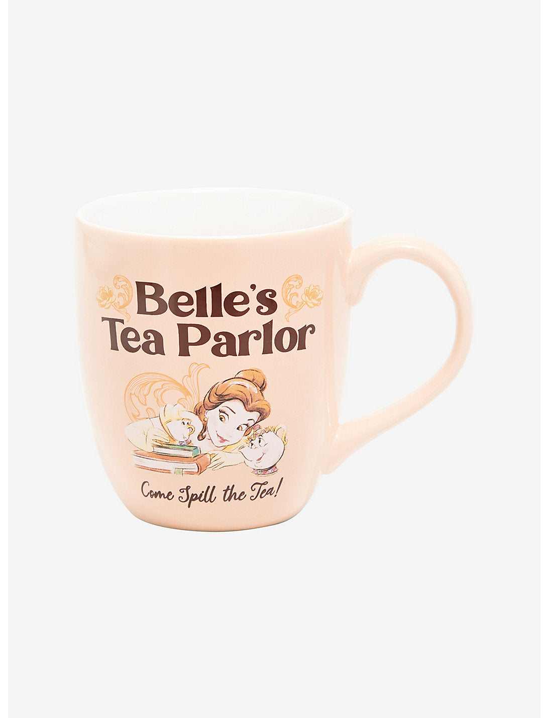 ¿Antojo de una taza de té caliente? ¡Belle te tiene cubierto! ¡Haz un viaje a la tienda ficticia con esta taza inspirada en La Bella y la Bestia! La princesa de Disney aficionado a los libros aparece entre "Belle's Tea Parlor" y "Come Spill the Tea!" letras como un gráfico estilo boceto junto con sus adorables amigos, la Sra. Potts y Chip. ¡Una manera perfecta de agregar un toque de realeza a su bebida!