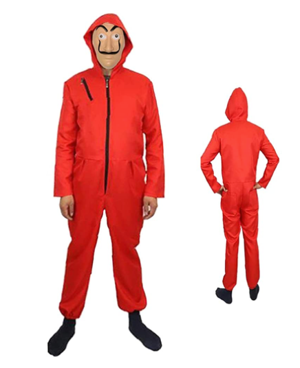 - Disfraz de la casa de papel unisex de la serie de televisión caliente. El disfraz viene con una máscara realista de Dalí. Este traje tiene bolsillos en la parte posterior de los pantalones y cremallera frontal para un uso fácil
