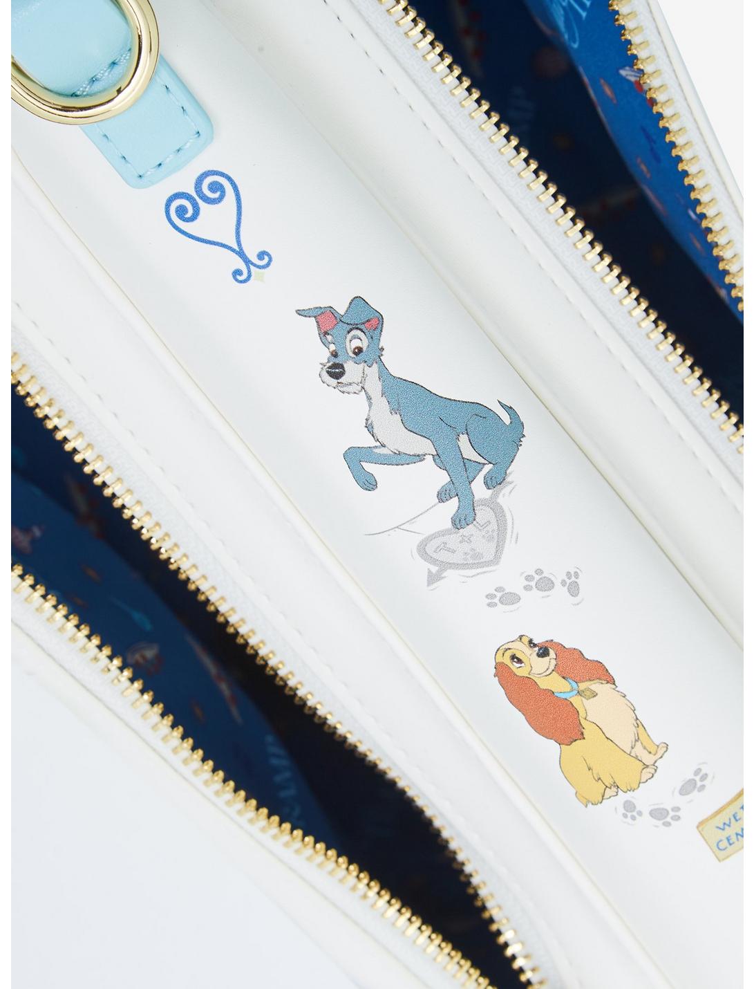 ¡Cualquier noche puede ser una bella notte con esta bandolera de La Dama y el Vagabundo! La correa ajustable permite que esta bolsa se use como una bandolera o una mini mochila. Cuenta con un hermoso gráfico de los caninos titulares, una insignia de marca esmaltada en la parte posterior y compartimentos con cremallera para mantener seguros sus elementos esenciales.