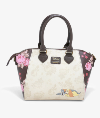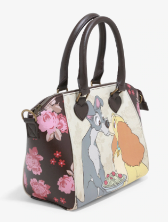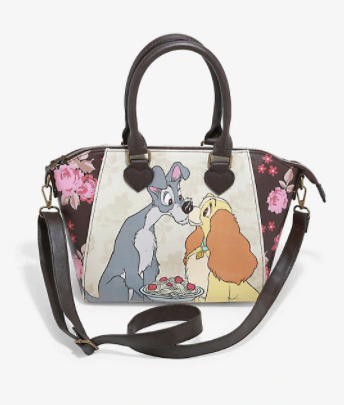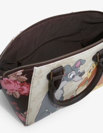 Celebre el clásico animado de Disney de 1955 con esta espaciosa cartera, impresa con gráficos de la dama y el vagabundo besándose en un lado y abrazados en el otro, con un estampado floral en todas partes. Cuenta con cierre de cremallera, bolsillo interior con cremallera y correa ajustable desmontable.