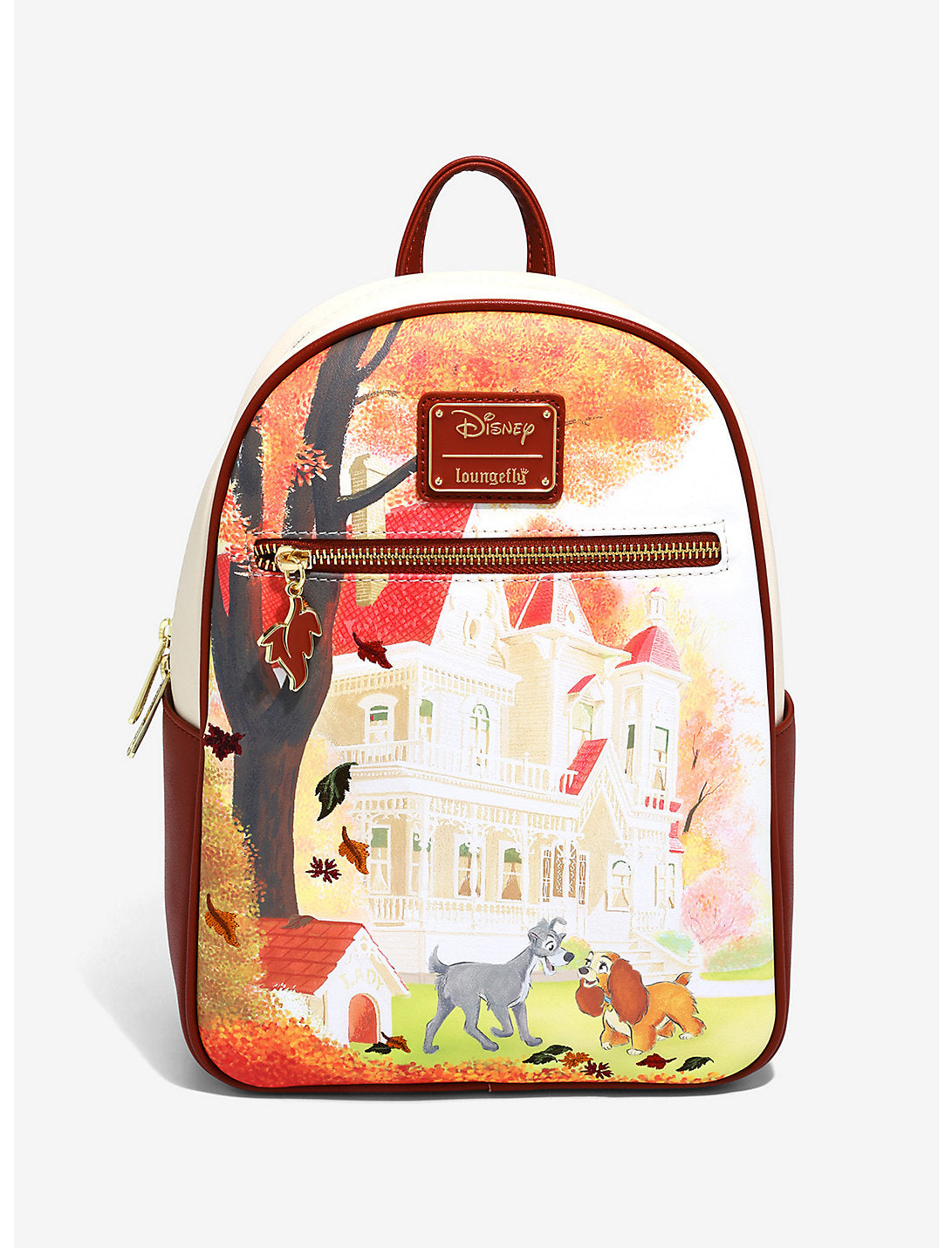 ¡Captura el amor de cachorro del clásico de Disney, La dama y el vagabundo, con esta mini mochila de Loungefly! Con un impresionante gráfico de acuarela de los dos tortolitos sonriendo frente a la casa de Lady con detalles bordados del follaje de otoño, esta mini mochila también cuenta con una hoja de otoño como dije de cremallera en el bolsillo frontal con cremallera. Este estilo también cuenta con herrajes en tonos dorados, insignia de la marca esmaltada, correas ajustables para los hombros y forro interior con temática otoñal.